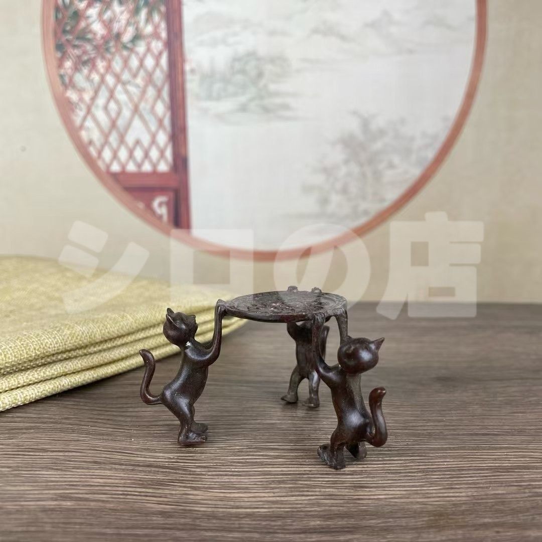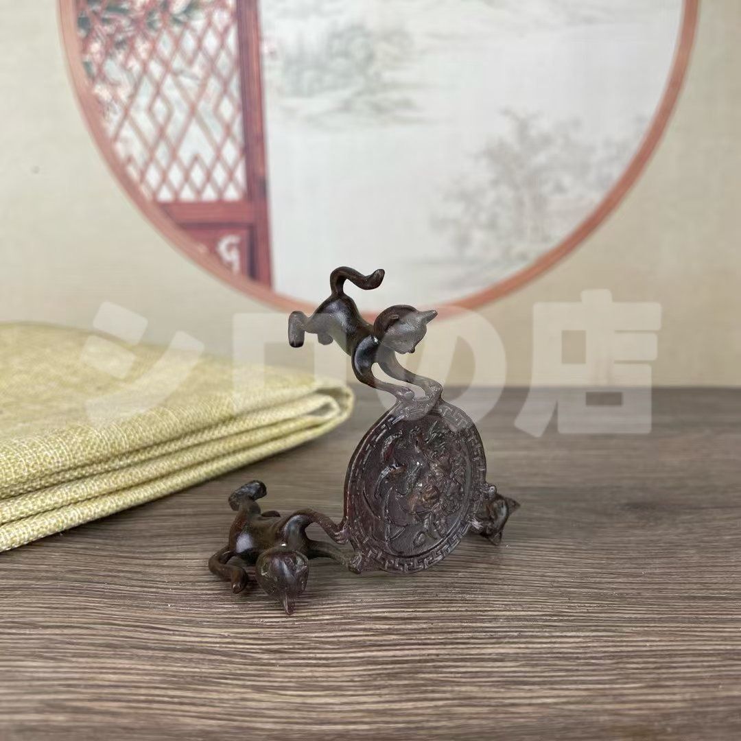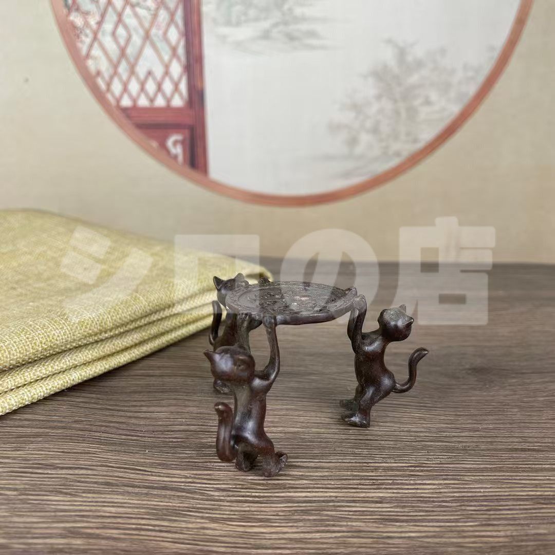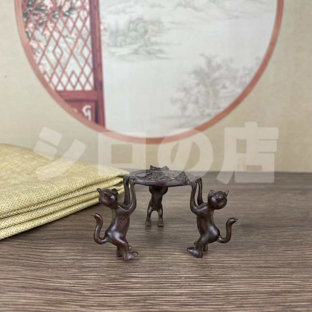 銅製の精緻な作りが、長い年月を経て輝きを増し、風水的にも安定と繁栄をもたらすと言われています。風水では、猫は家や店舗に良いエネルギーを引き寄せ、守護神としてその空間を守る力があるとされており、「三猫茶壺蓋置」はその象徴として、日々の運気を支える存在となることでしょう。
