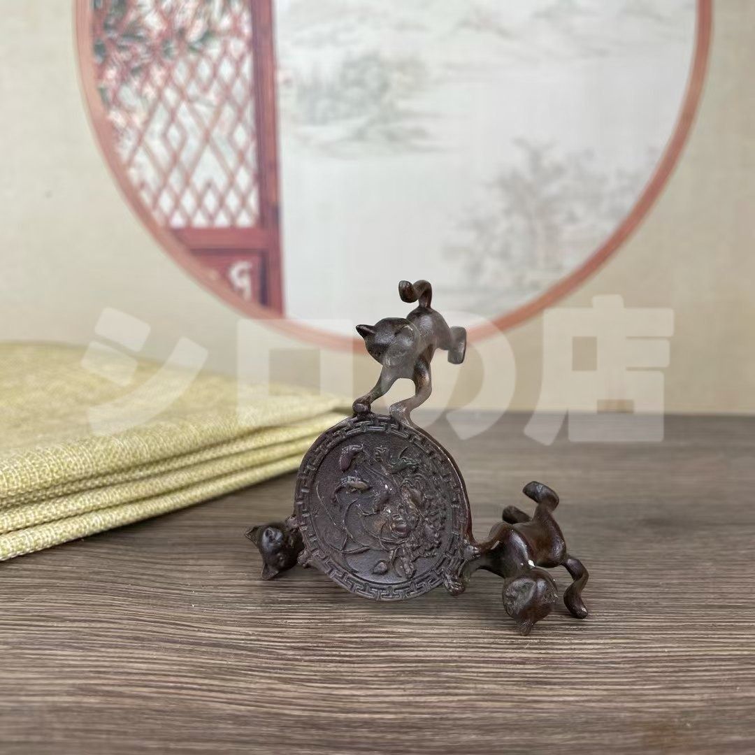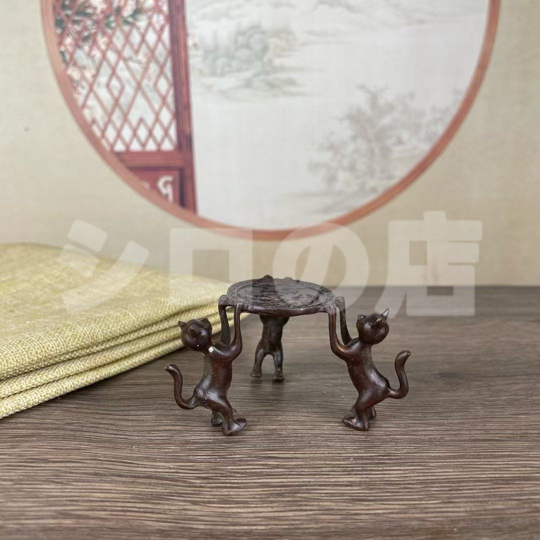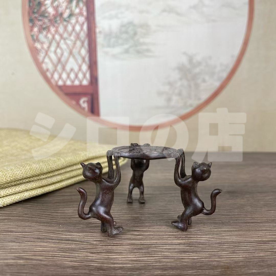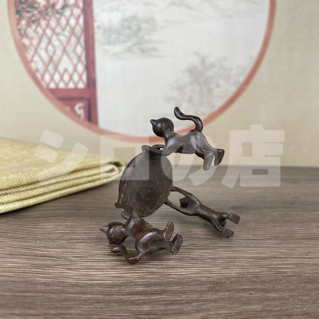 銅製の精緻な作りが、長い年月を経て輝きを増し、風水的にも安定と繁栄をもたらすと言われています。風水では、猫は家や店舗に良いエネルギーを引き寄せ、守護神としてその空間を守る力があるとされており、「三猫茶壺蓋置」はその象徴として、日々の運気を支える存在となることでしょう。