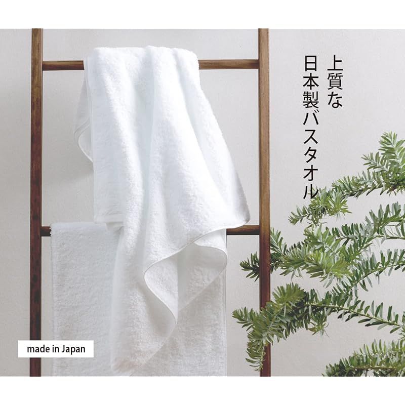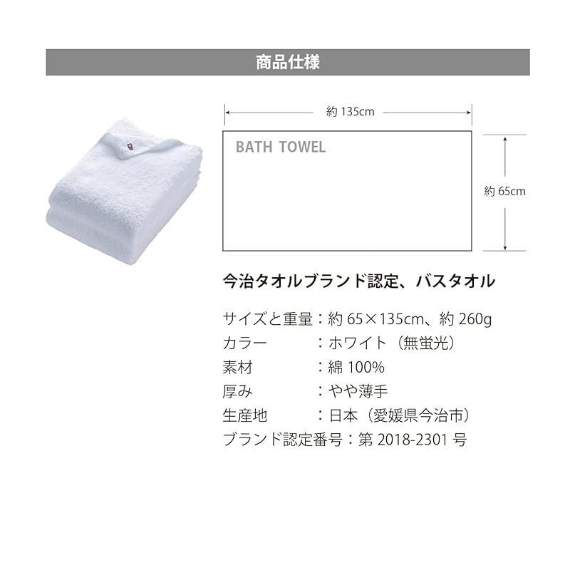 【今治タオル認定番号】第2018‐2301号 【サイズ(1枚)】約65×135cm (一般的に多いバススタオルのサイズは約60×120cm) 【重量(1枚)】約260g(家庭用バスタオルの一般的なボリュームは250~310g) 【原材料】綿100%(原材料にはホテル仕様にも使用される良質なコットンを使用し、綿ほこりの少ない丈夫で吸水性と速乾性に優れた、肌触りの柔らかいタオル生地です) 【色】ホワイト(無蛍光晒)【製造】愛媛県今治市