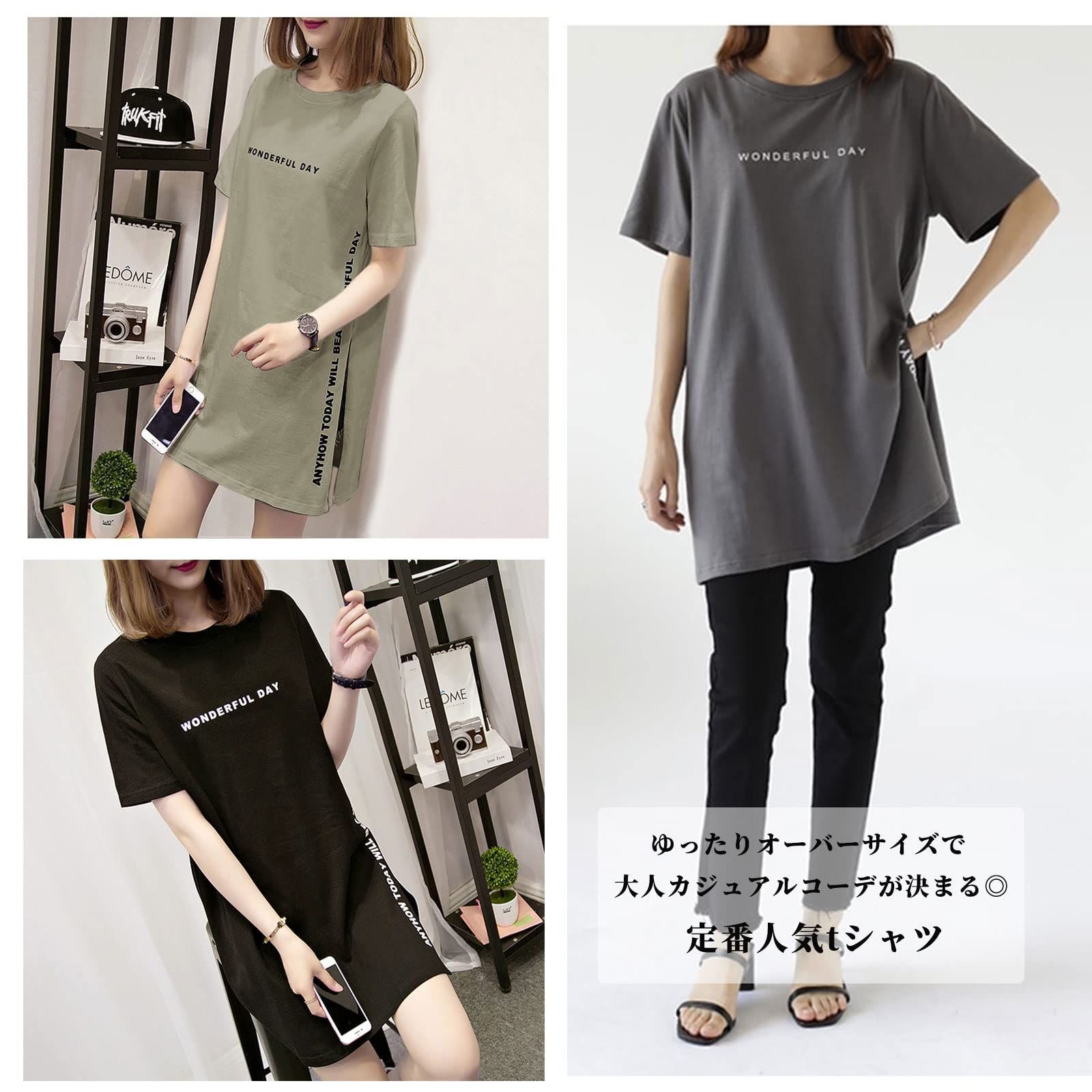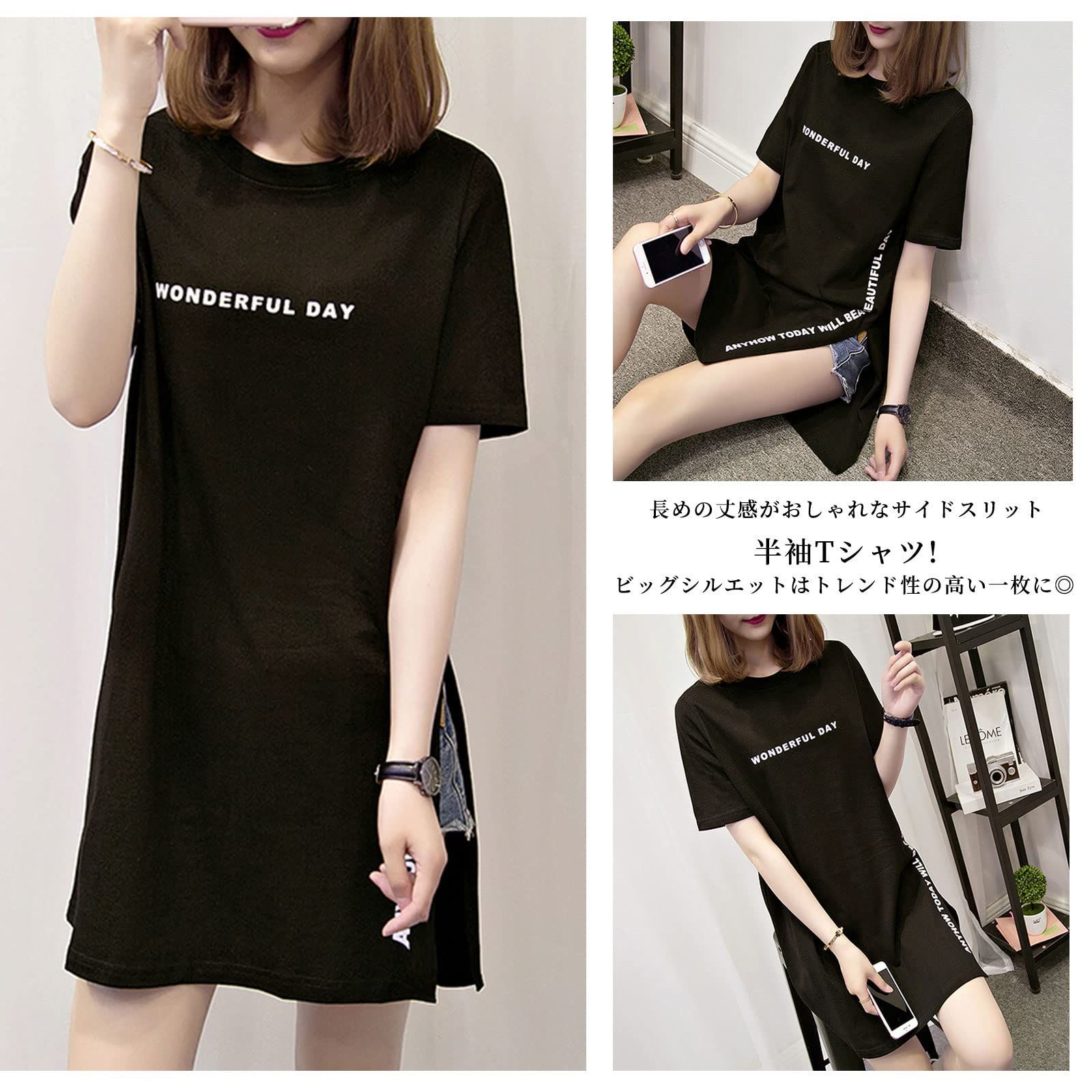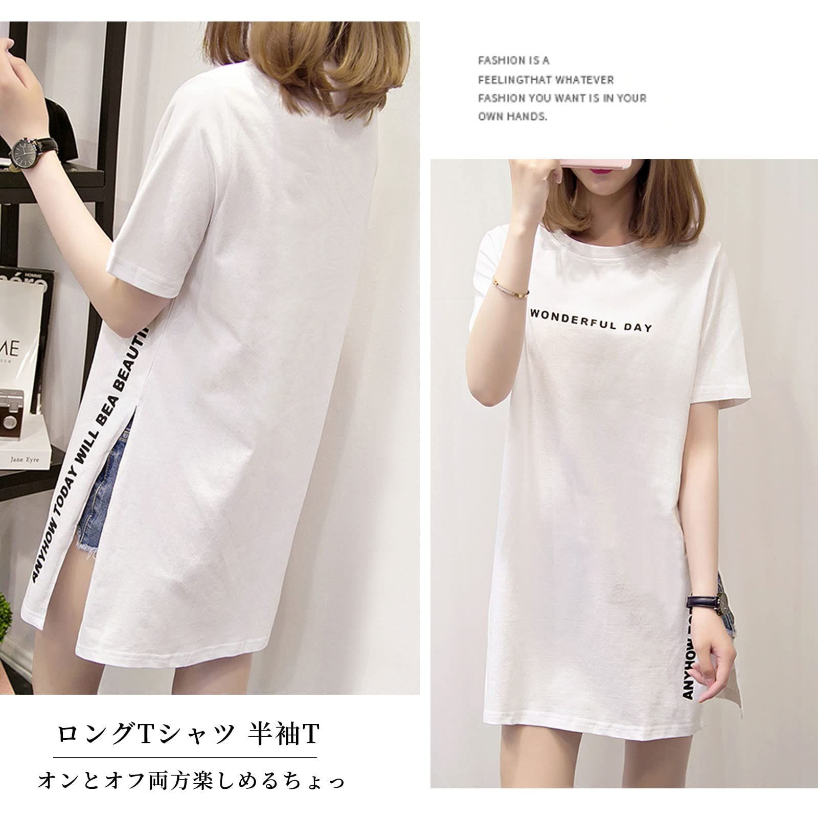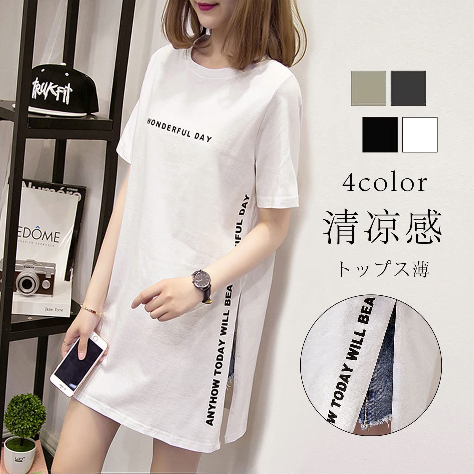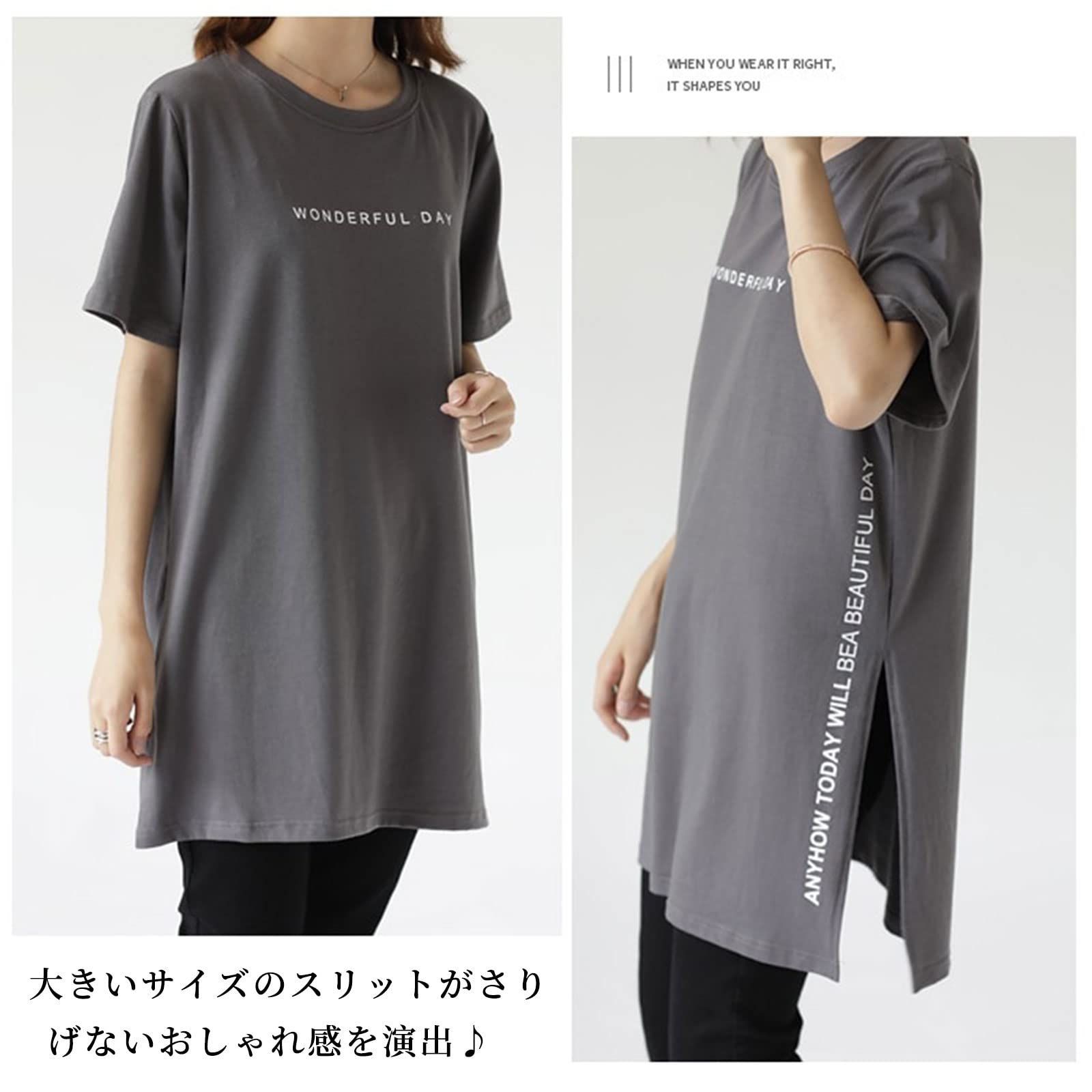 【人気商品】ゆったりトップス 夏 無地 大きいサイズ カットソー ロゴTシャツ ロング丈 サイドスリット 半袖 通気性がいい ラウンドネック レディース プリント 可愛い tシャツ きれいめ 通勤 [7-livehouse] オフィス