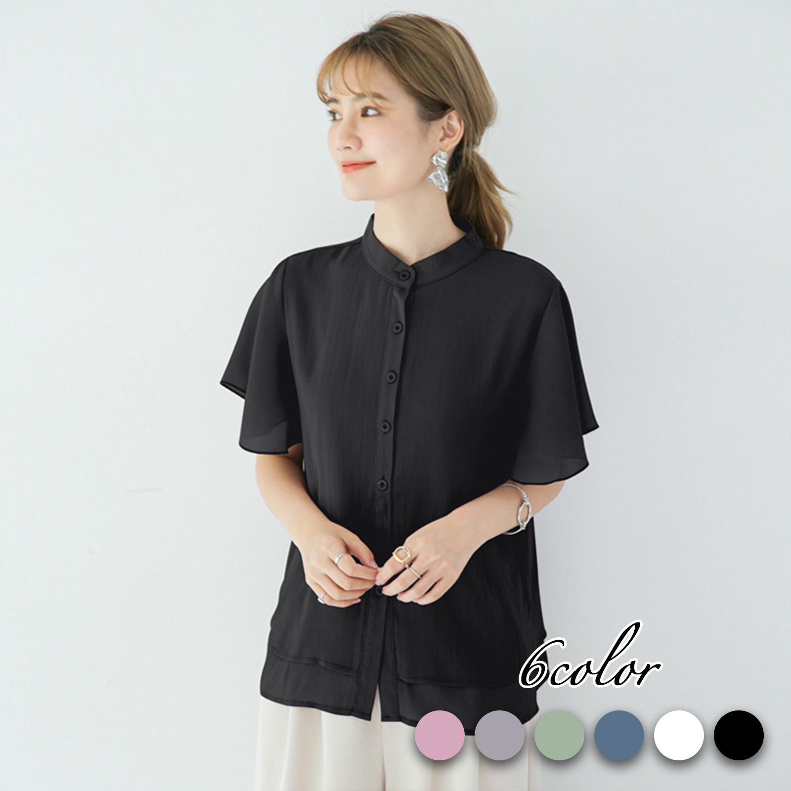 #ラッフルスリーブ #ブラウス #レディース #半袖 #シフォン #トップス #スタンドカラー #透け感 #袖フリル #楊柳 #シャツ #きれいめ #仕事 #可愛い #送料無料 #数量限定 #安心安全 #追跡可能配送