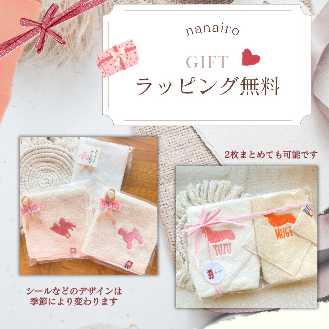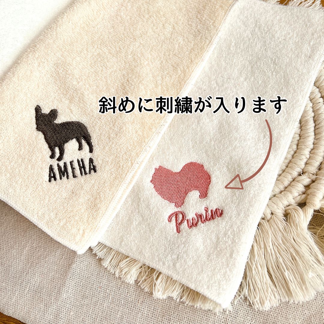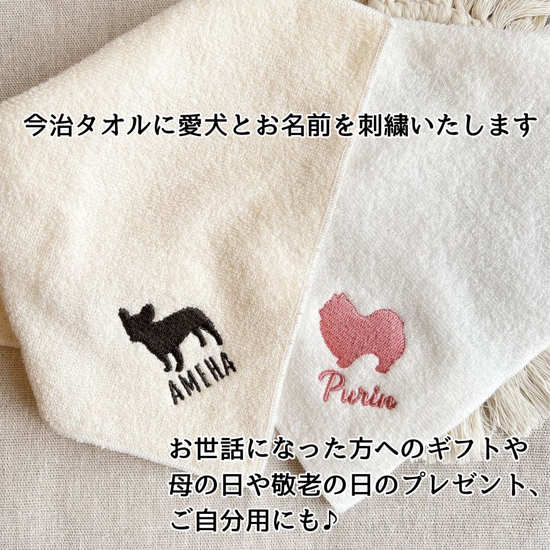 ※こちらはオーダーページのため、下記内容をご覧になりオーダーお願いします※ 今治タオルに愛犬のシルエットとお名前を刺繍いたします♡ 二頭までのシルエットとお名前刺繍が可能です(+300円) 現在はTOP画像よりもお名前の大きさを大きく刺繍しております。 シルエットのみも可能です。 メモリアルの返しや、お世話になっている愛犬家の方へのギフト、母の日、父の日、敬老の日などのイベントへのギフト、またご自分用にいかがでしょうか? 簡易ラッピング無料です♪ ※5枚以上ご購入でリボンが付きます 〇サイズ...20cm or 25cm 〇タオルのお色...ホワイト or ナチュラル 〇刺繍糸...16色 ラッピング無料* 様々なイベントに応じたシールをご用意しております♪ ----------------------------------------------- 【 金 額 】 20cmタオル...刺繍入りで950yen 25cmタオル...刺繍入りで1100yen ----------------------------------------------- 【 ご注文内容 】 質問するより下記内容をお知らせ願います↓ 1.タオルのサイズ 2.タオルの色 3.刺繍するお名前 4.刺繍糸の色 5.書体 6.犬種 7.枚数 8.簡易包装の有無と用途 (Foryou,Thankyou,感謝,いつまでもお元気で等) 数が多い場合は事前にご相談くださいm(__)m 3000円以上でクリックポスト送料無料 10000円以上で宅配便送料無料 ----------------------------------------------- 綿100% 今治産タオル | 注意点  | ・載せられる画像の枚数に限りがあるため、すべての書体を載せておりません。 イメージを確認されたい方は事前にお申し付けくださいませ。 ・モニターの具合により色が変わりますことご了承ください。 ・タオルへの刺繍は柔らかいものへの加工のため、多少のズレが生じることもございます。 ・製法上、刺繍の上に透明のフィルムが一部残っておりますがお洗濯で溶けて消滅します。 ・枠を張って加工をするため、ループに枠の跡が残る場合もございます。 お使いのうちに取れます。 ・漂白、染色をしていない生成りの製品は、生地に黒や茶色のポツポツが見えることがあります。 これは製造工程で取りきれなかった綿カス(綿花の葉や茎)で、害はなく洗濯するごとに減少します。 ・洗濯は洗濯ネットを使用して優しくお洗濯してください。 ・生産ロットにより、同色でも色味の違いや、綿実油による特有のにおいが生じることがございます。 | 発送について  | 約7営業日以内に発送させて頂きます。 数が多い場合は納期ご相談いたします。 刺繍が出来上がり次第、発送させて頂きますので発送目安日より早くなる場合もございます。 ● メール便での発送の為、お届け日のご指定は承っておりませんが、お使いの日がお決まりの場合は間に合うように発送させて頂きますのでご相談ください。 ハンカチの1配送辺りの枚数が多い場合は宅配便に切り替えさせて頂きます。 バレンタイン ホワイトデー お祝い 節分 敬老の日 ギフト 母の日 父の日 卒業 卒園 卒対 記念品 名入れハンカチ 入学 引っ越し 転勤 異動 退職 名入れギフト 記念品 部活 スポーツ 卒団 クラブチーム ハンドタオル ギフト  名入れタオル 刺繍  検索用 秋田犬 アメリカンコッカースパニエル アメリカンブリー イタリアングレーハウンド イングリッシュコッカースパニエル ウェルシュコーギー コイケルフォンディエ ゴールデンレトリーバー シーズー シェルティ 柴犬 ジャーマンシェパード ジャックラッセルテリア スカイテリア スコッティテリア スピッツ ダックスフンド チャウチャウドゥードル トイプードル キャバリアキングチャールズスパニエル チワワ ポメラニアン パグ パピヨン ピットブル ビションフリーゼ プードル ブルドッグ ブルテリア フレブル フレンチブルドッグ ボストンテリア ボクサー マルチーズ ミニチュアシュナウザー ヨークシャーテリア ラブラドルレトリーバー マルプー ワイマラナー ミニチュアピンシャー チワプー チワックス ハンドタオル うちのこ