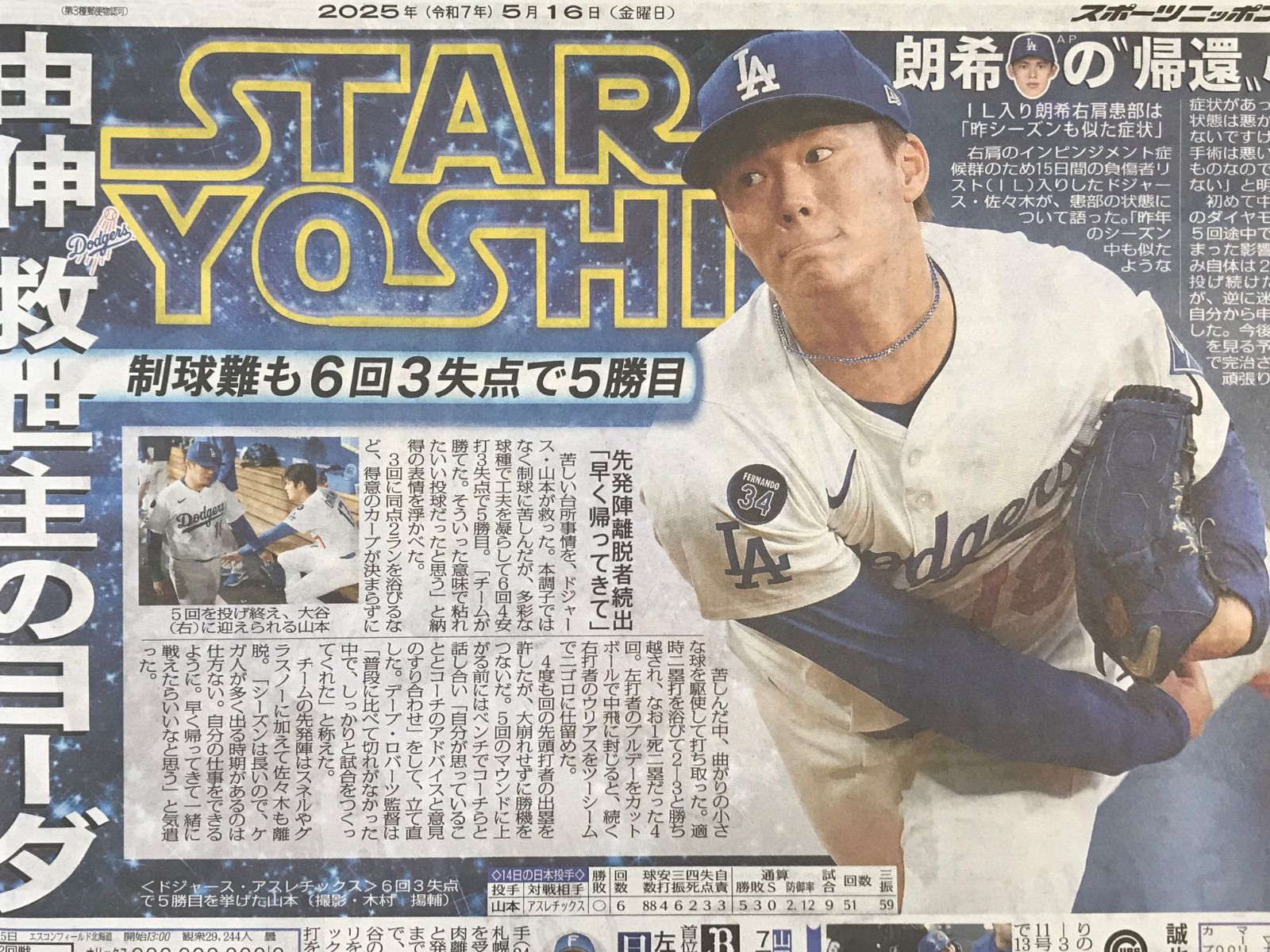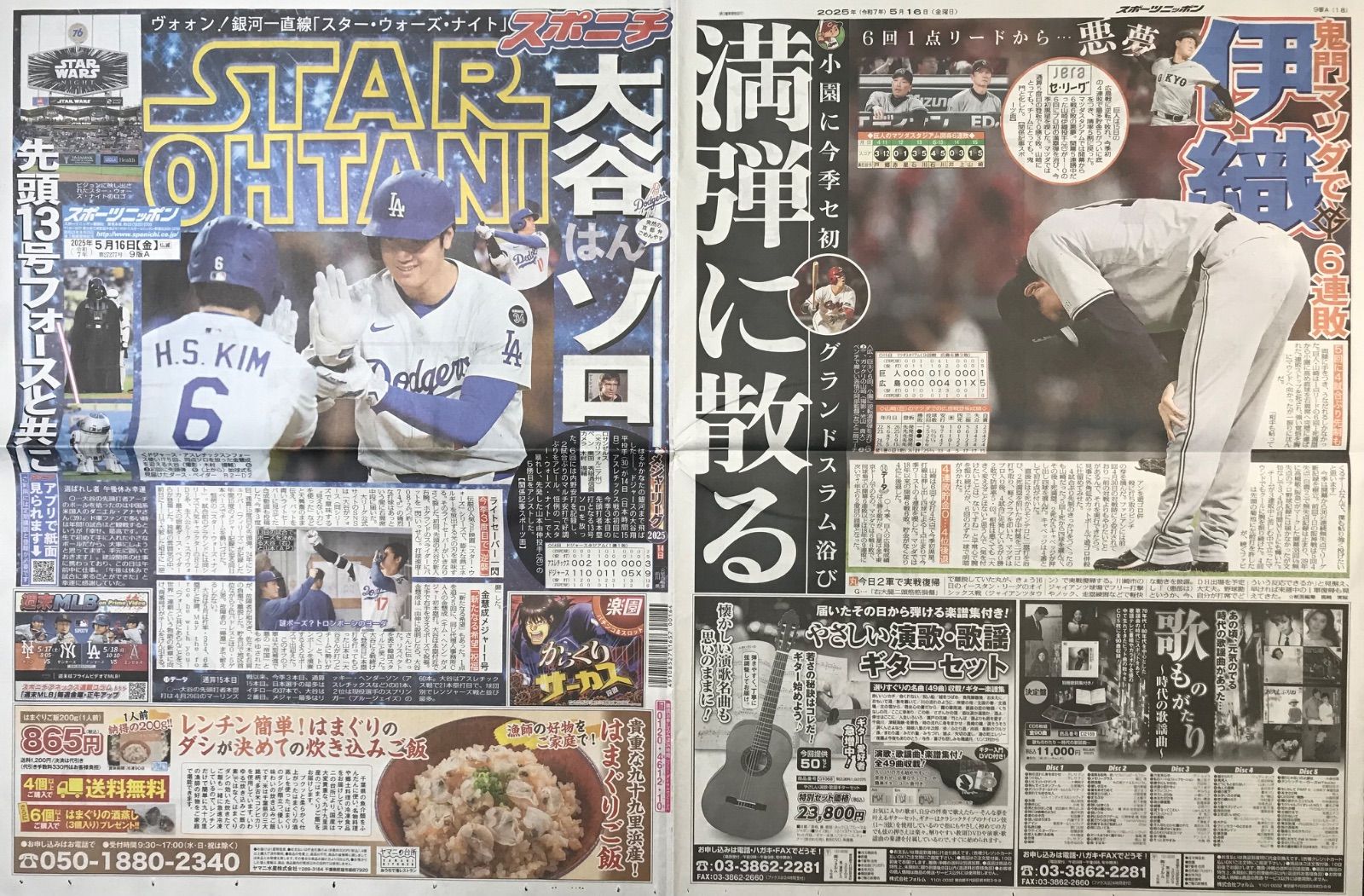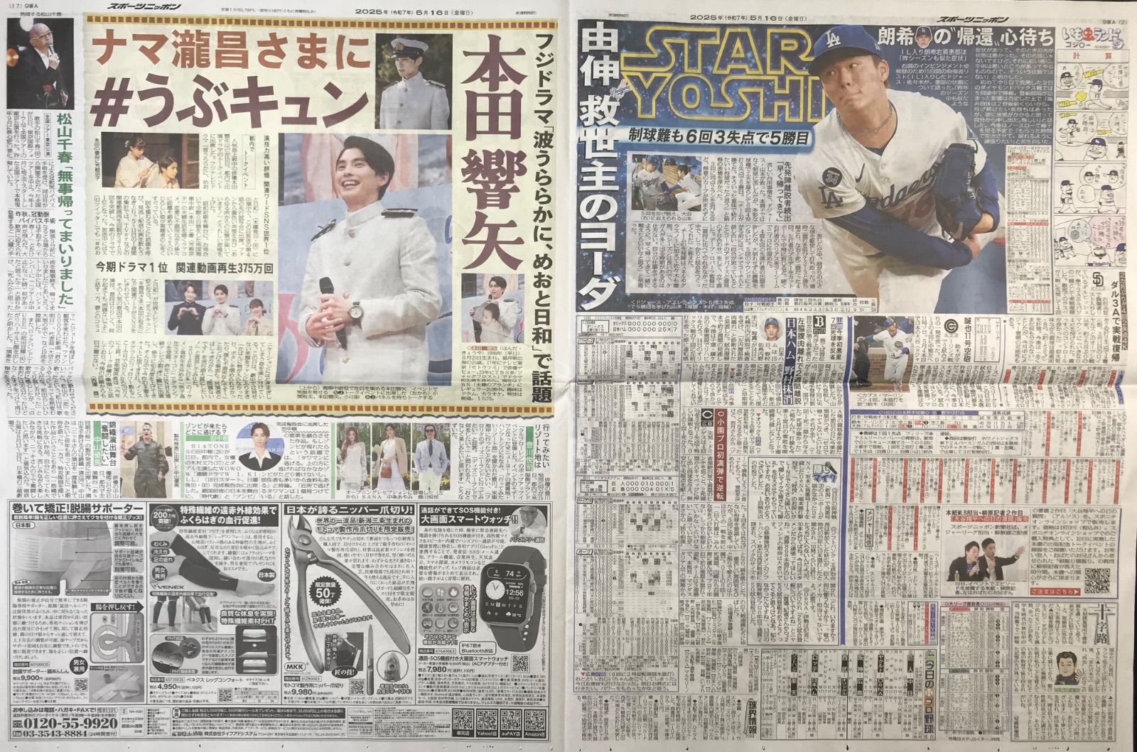 スポニチ 2025.5/16号 ◉1/2/17/18p 本田響矢/波うららかに、めおと日和/大谷翔平/ドジャース/メジャーリーグ/野球/山本由伸/山崎伊織/巨人/読売ジャイアンツ/野球