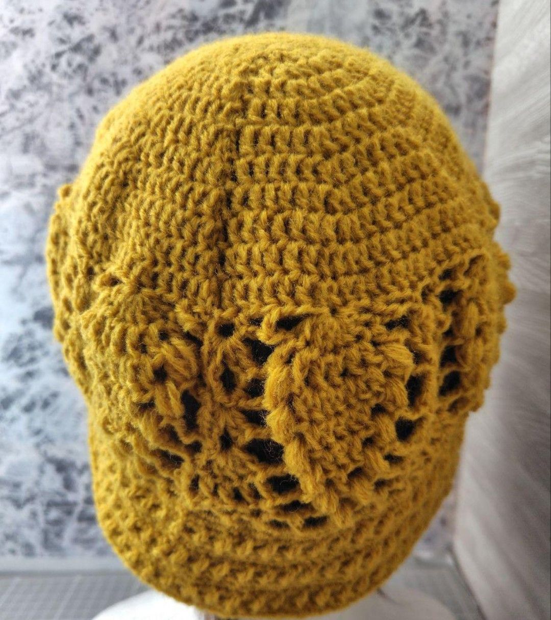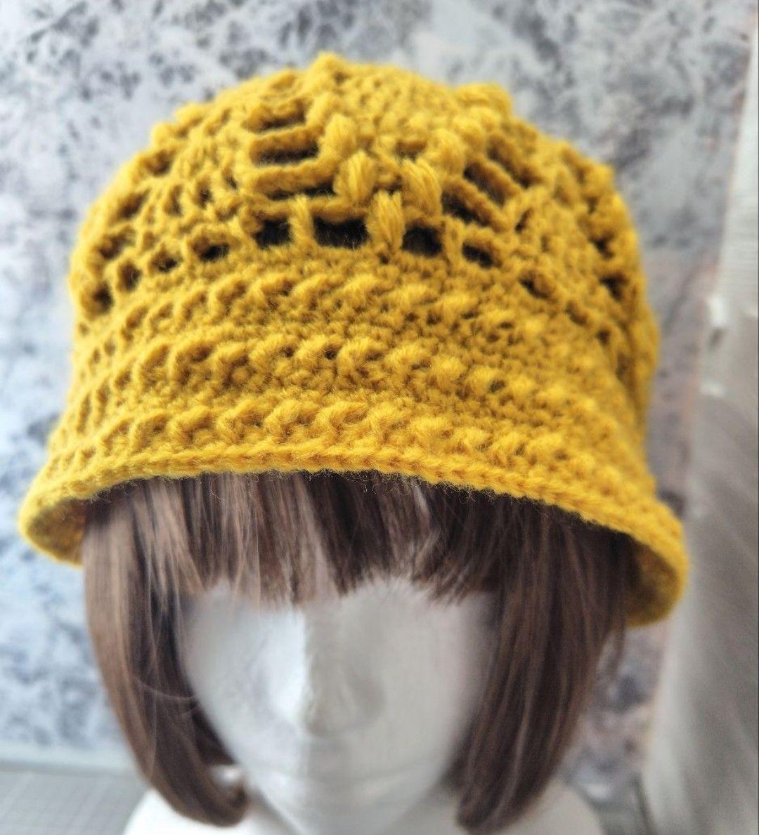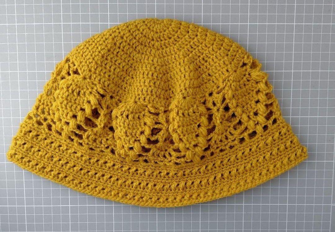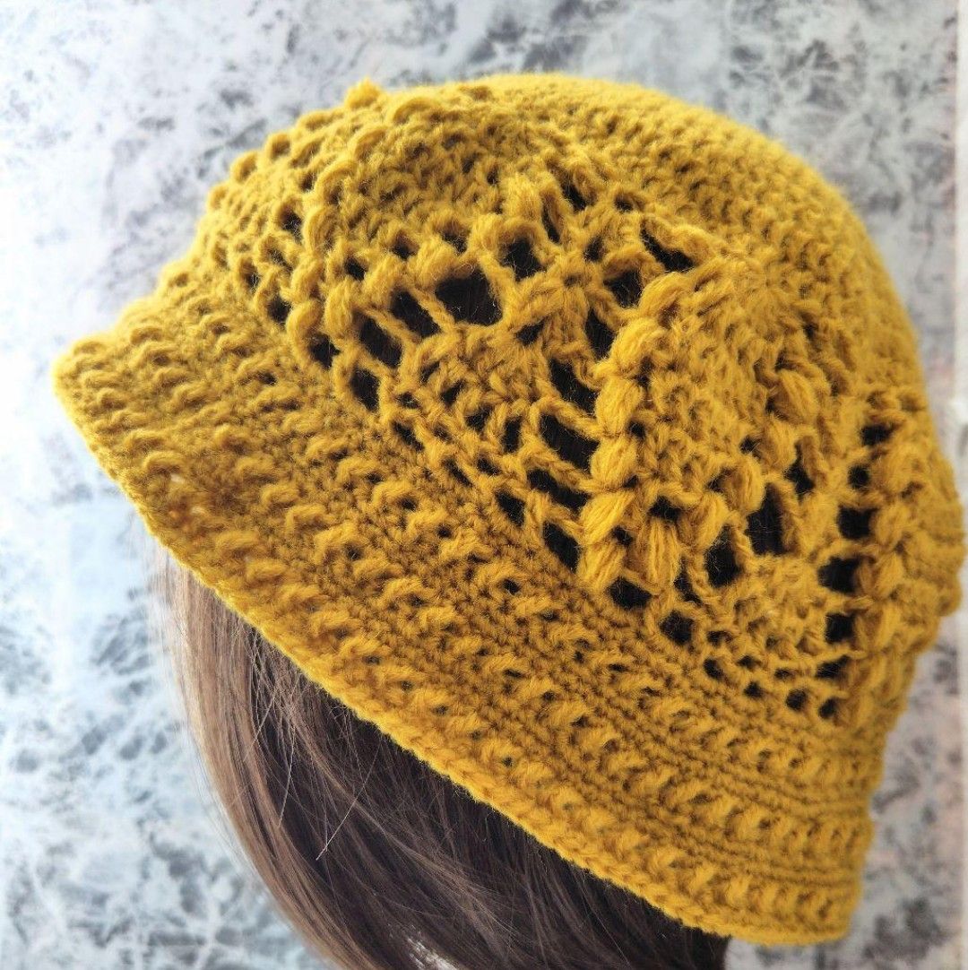 秋冬 クロシェハット クラッシャーハット 辛子色 ウール混 アクリル パイン編み 透かし編み かぎ針編み バケットハット