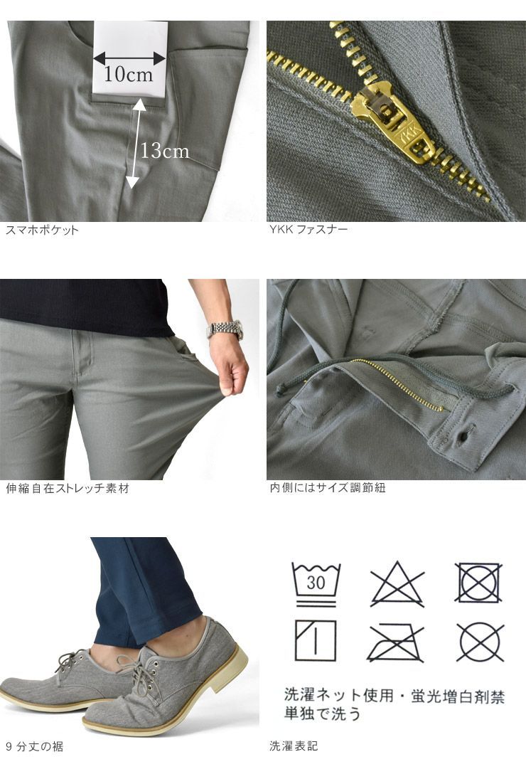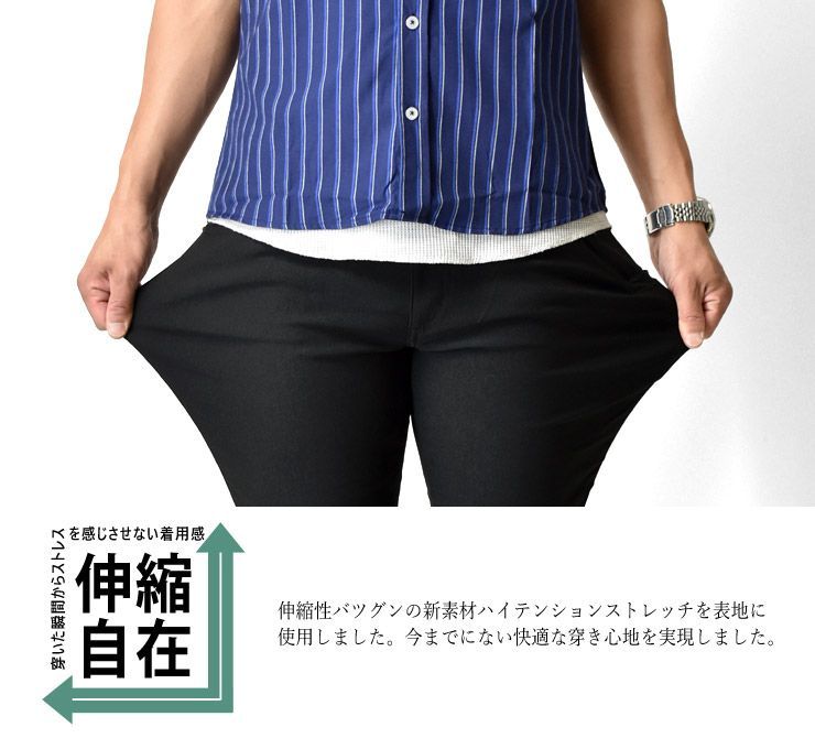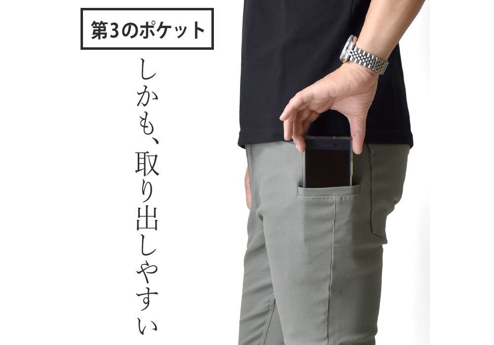 スーパーハイテンションストレッチ素材を使用した伸縮性バツグンのチノパンツ!ヒップもウエストも全部が伸びるストレッチ素材のチノパンツです。ゴムのように伸び身体のラインに合わせてフィットするから見ためはスッキリ!使い心地はとっても楽!一度穿くと手放せなくなる事間違いなし!また、スマホが入る第3のポケットを装備し使いやすさも劇的に進化しました。使いやすさも穿きやすさも兼ね備えたお勧めの一本です。