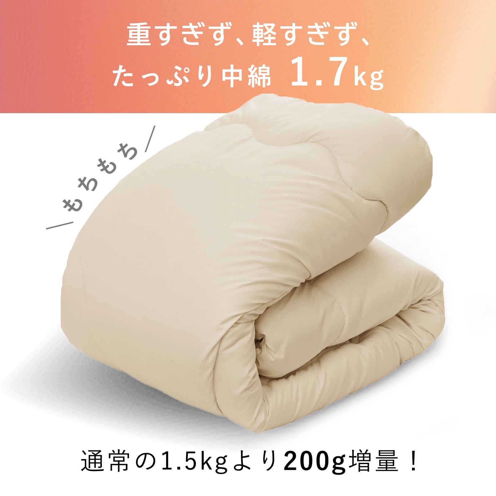 【ボリュームたっぶり 通年うれしい暖かさ】中わたを従来の1.5kgから1.7kgに増量。ボリューム感たっぶりなので、春秋冬と幅広く暖かく使えます。真冬でも毛布と併用すれば十分暖かく過ごせます。ロングサイズなので、背の高い方も足元がすっぽり包まれ、暖かく過ごせます。