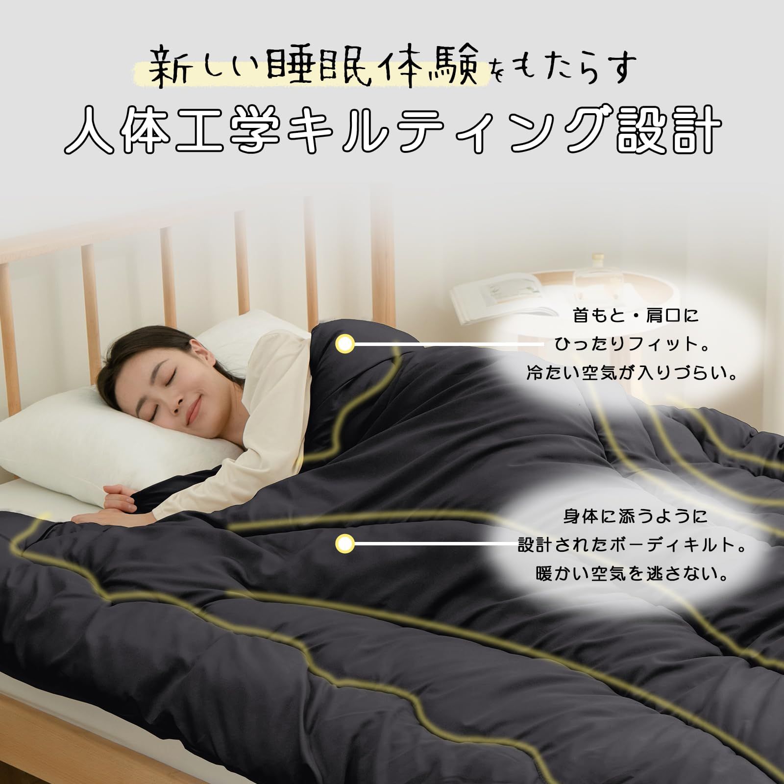 【保温性抜群のボディライン】ボディラインキルトを採用しているので、身体にぴったりフィットします。肩口までしっかり包み込む設計なので、暖かさが逃げません。保温性に優れ、身体に優しくフィットする布団です。