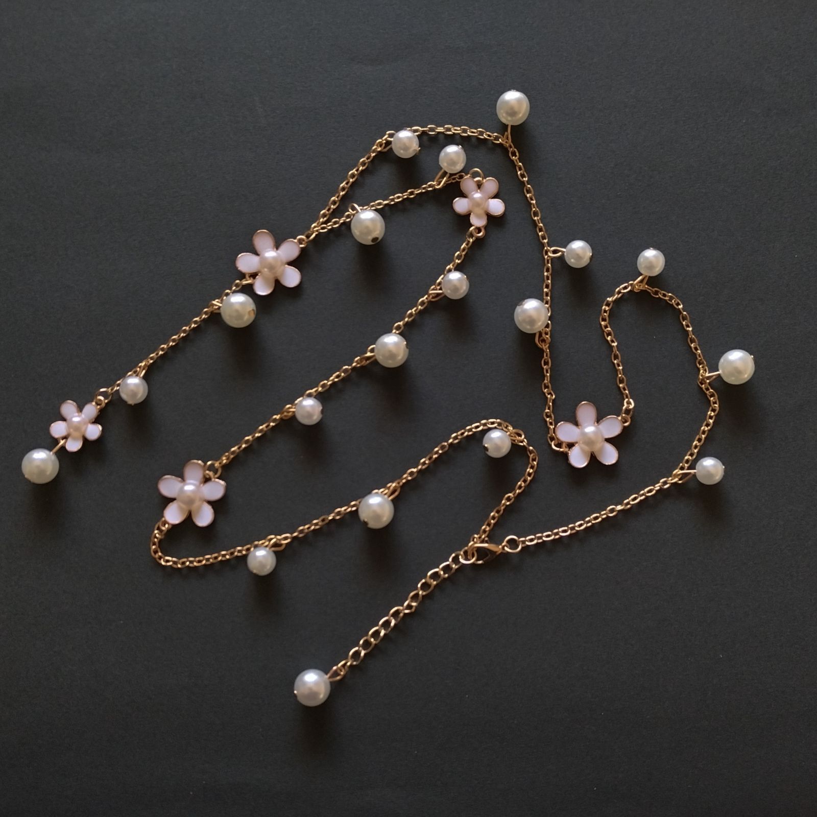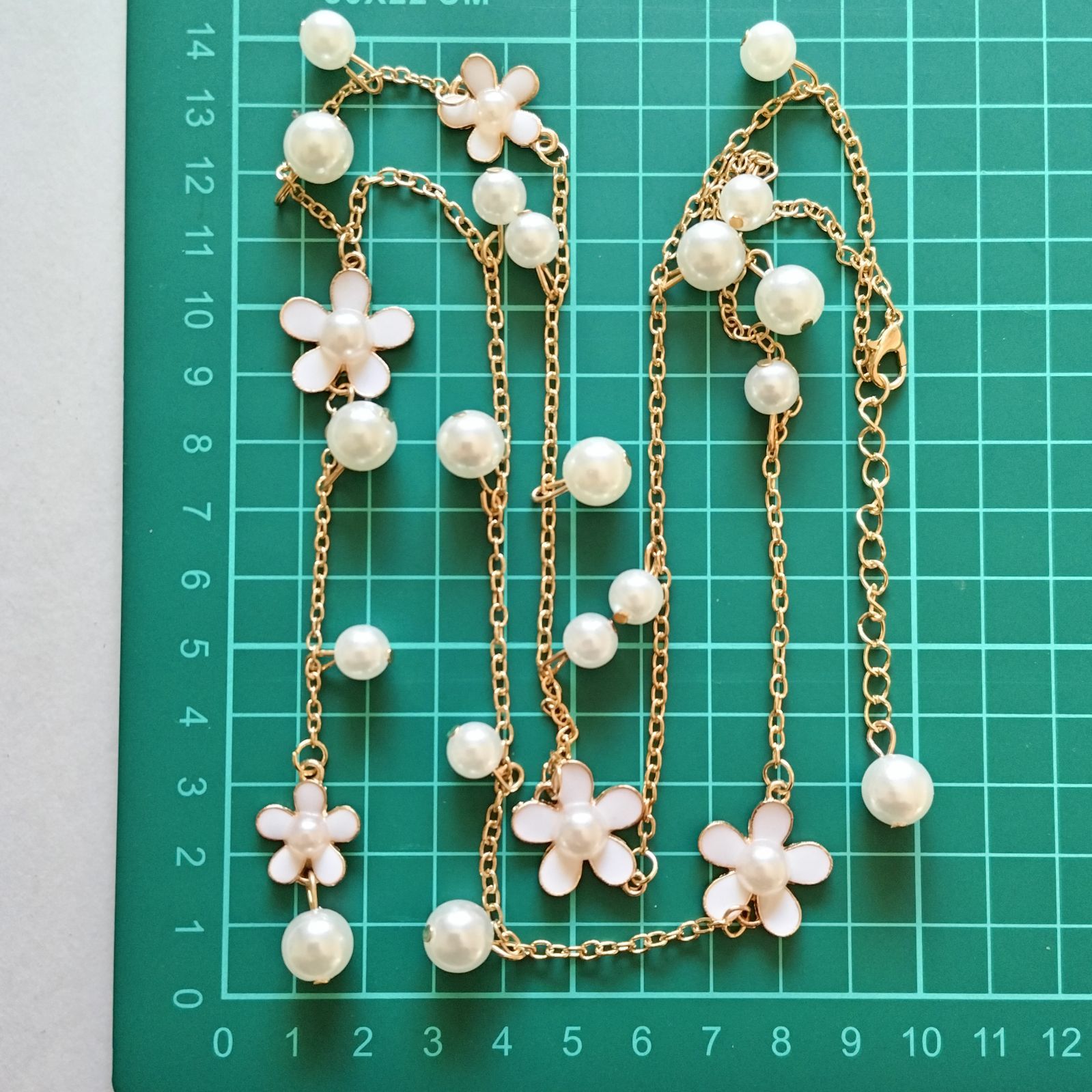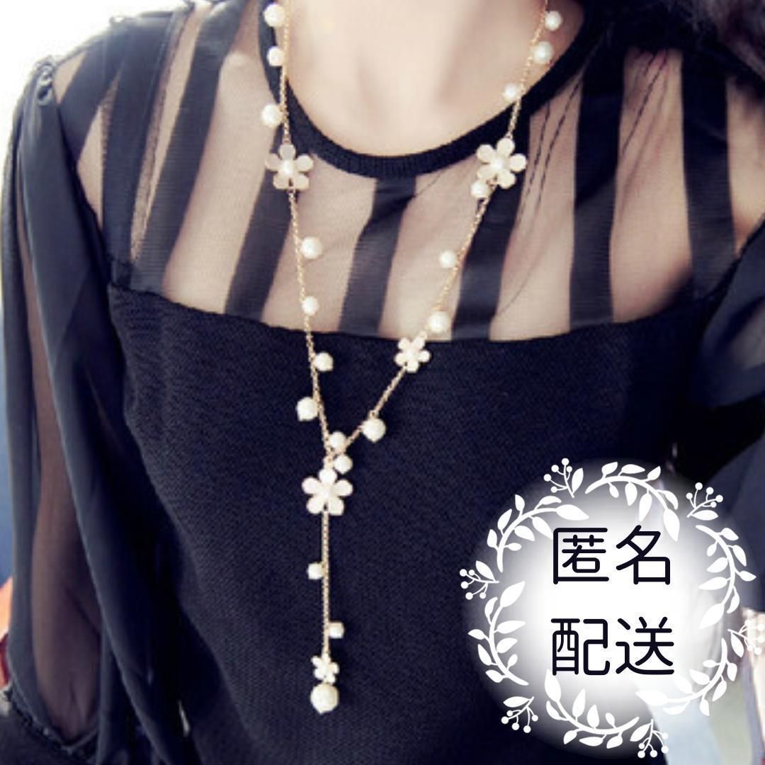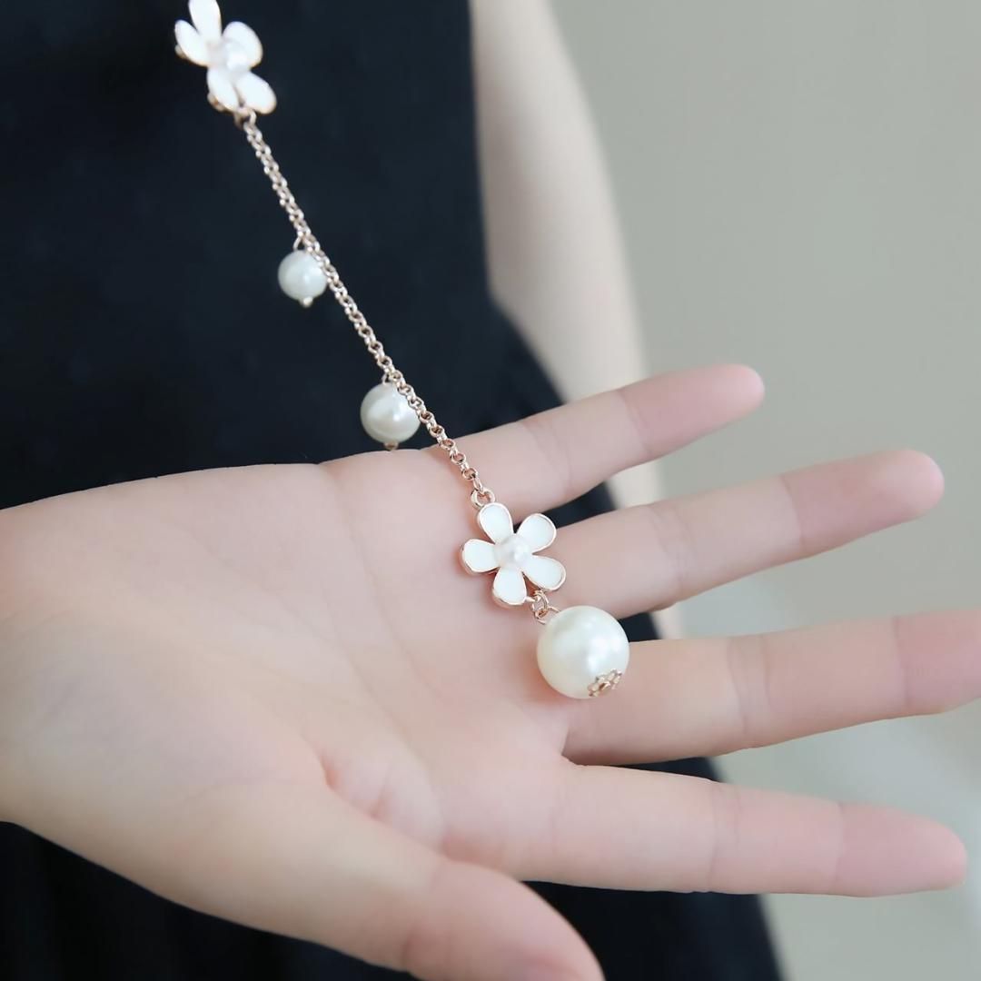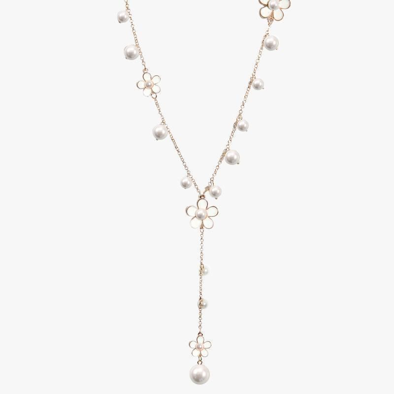 特別仕様♪花とパールのラリエット風 ロングY字ネックレスホワイトゴールドフラワーかわいい