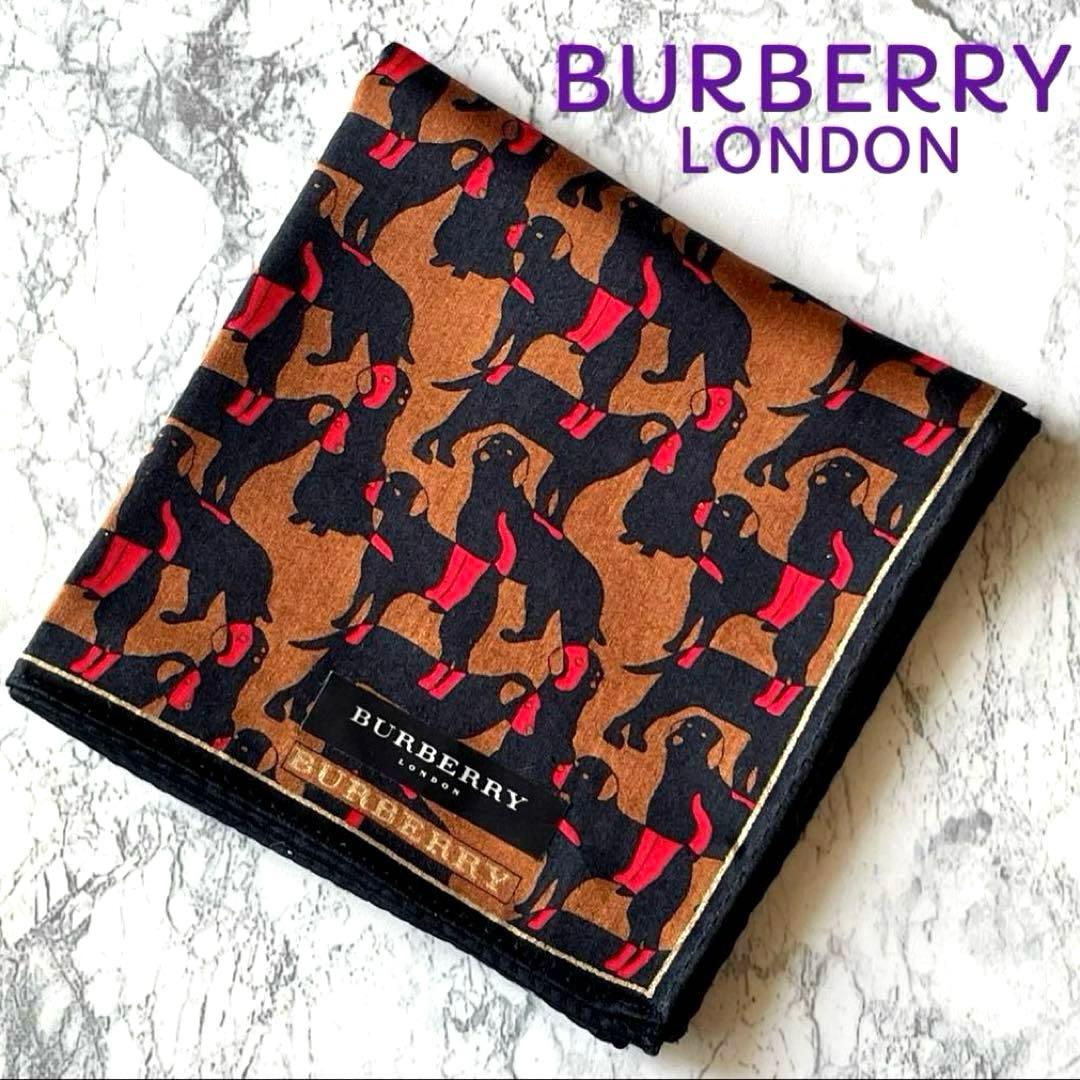 ◆未使用◆バーバリー ハンカチ 犬 総柄 ロゴ ブラウン