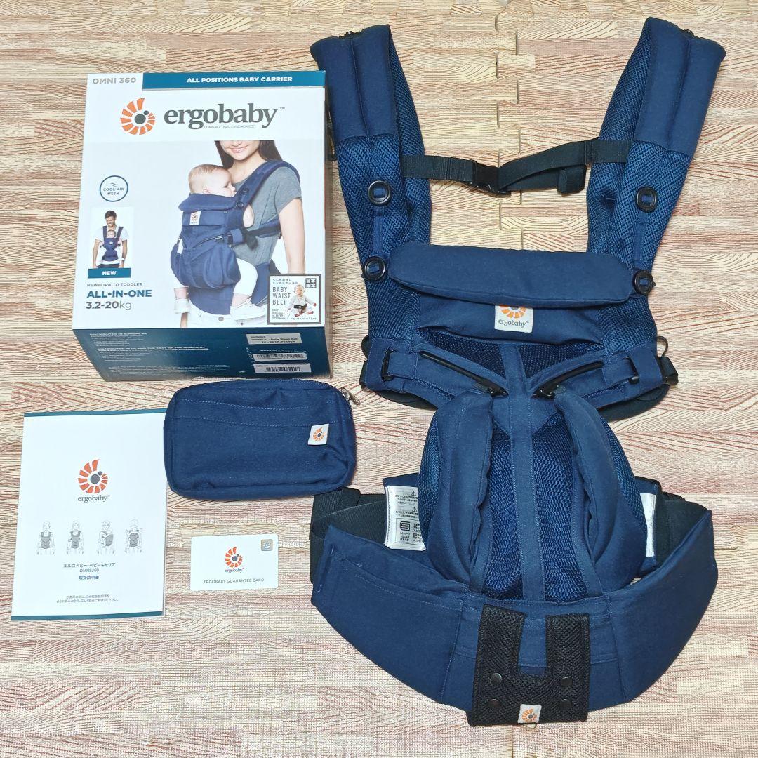 2018年に購入し、1人の子が1年ほど使用しました。 メッシュ素材で通気性が良いです。 ベビーカー利用がメインだったので、使用回数は少なめで、見た目も綺麗だと思いますが、ゴム部分に経年劣化による伸びが見られます。(写真の矢印の箇所) 外箱、説明書、期限切れですが保証書、その他付属品すべて揃っています。 外箱は折れや潰れなどの傷みがあります。 ゴム以外の状態は良好で廃棄するのがもったいないので、ゴムの部分が気にならない方がいれば、お安くお譲りいたします。 - ブランド: ergobaby - モデル名: omni360 - カラー: ネイビー - 付属品: 収納ポーチ、説明書 - デザイン特徴: メッシュ素材、調整可能なストラップ - 機能: 多機能ポジション対応 人気モデル...オムニ360 抱っこ方法...タテ抱っこ, おんぶ, 前向き抱っこ