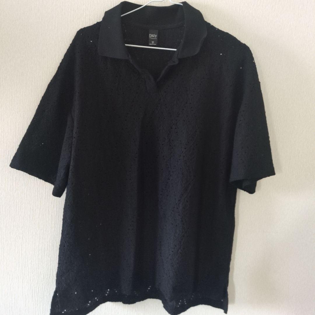 レース模様 ブラックポロシャツ 半袖