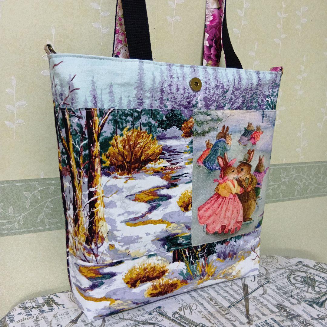 ハンドメイド ウサギと花柄のビッグトートバッグ