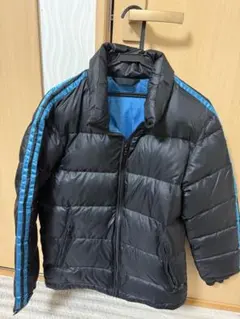 黒のダウンジャケット 青ストライプ付き