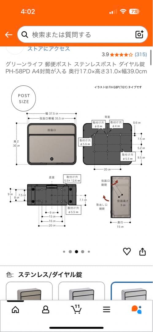 PH-58PD 家庭用郵便ポスト(18-8ステンレス) ダイヤル錠付き