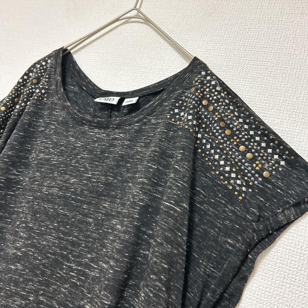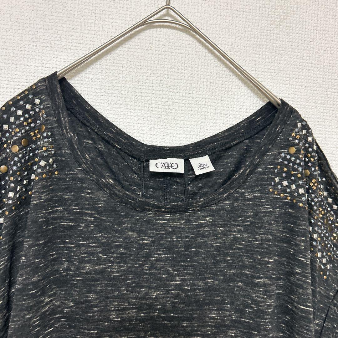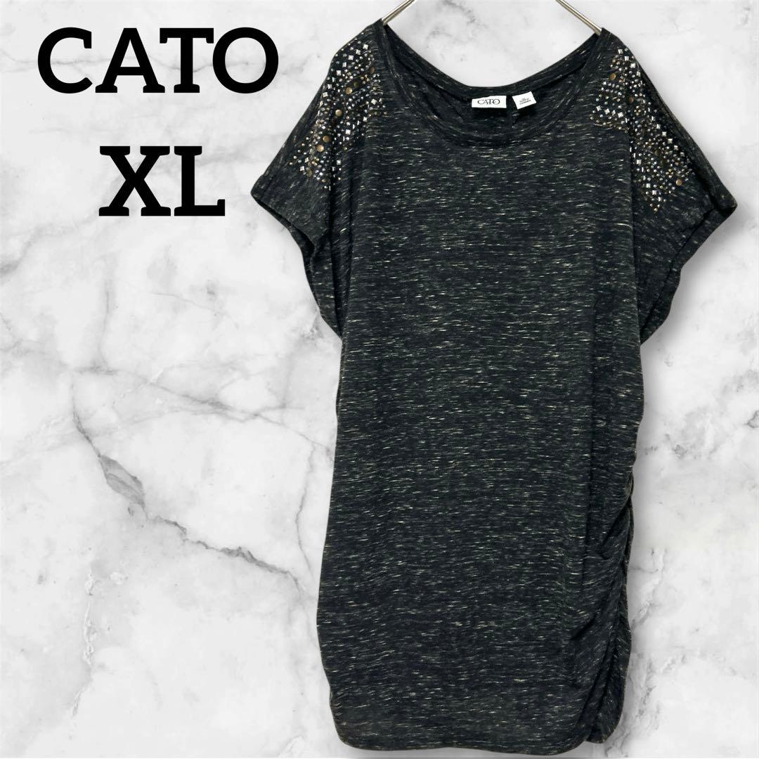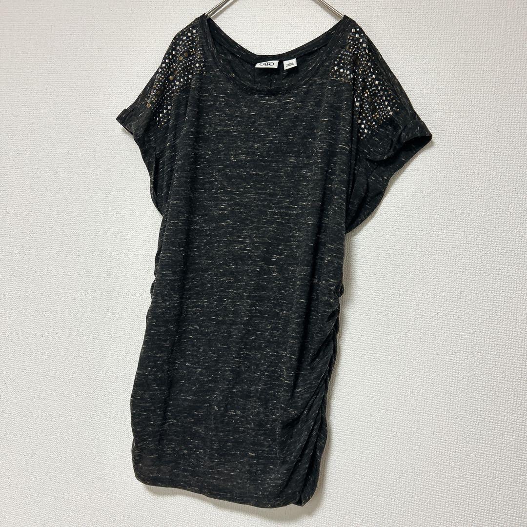 レア✨CATO XL 半袖チュニック サイドギャザー 黒 クルーネック ビジュー