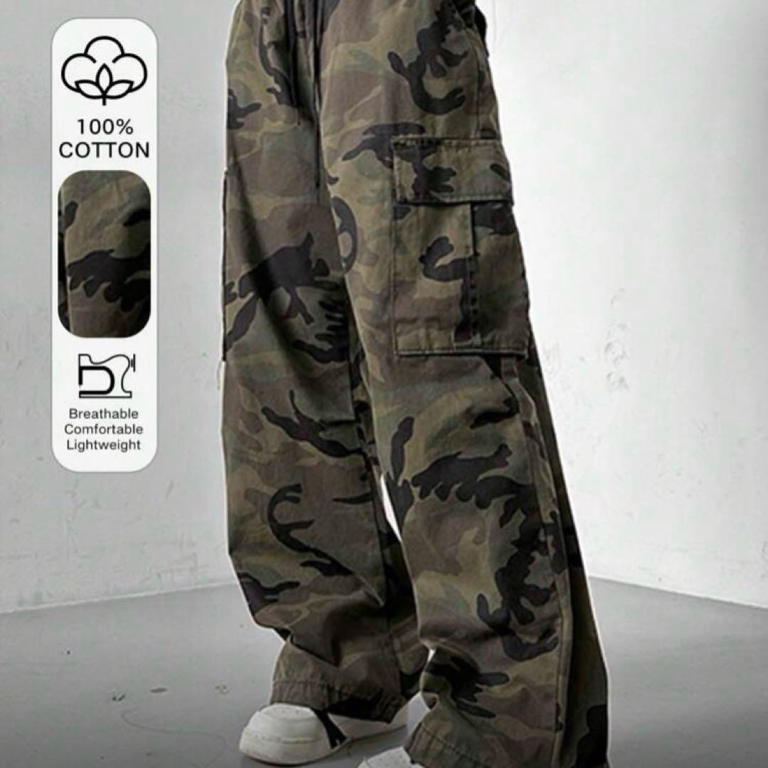 アーミーグリーン迷彩カーゴパンツ ウエスト紐付き カモフラージュプリント