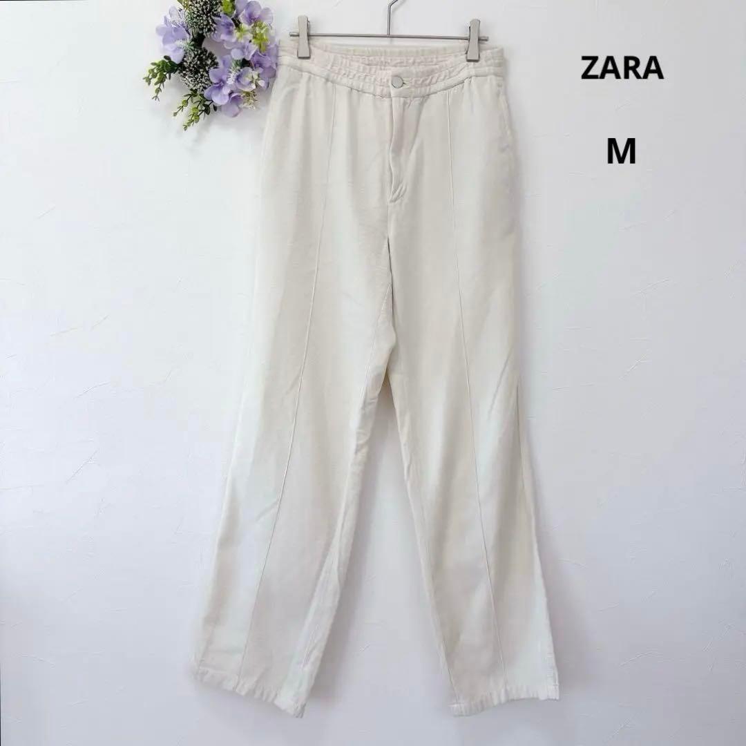 ザラ ストレート ワイドパンツ デニム調 ホワイト M ウエストゴム カジュアル