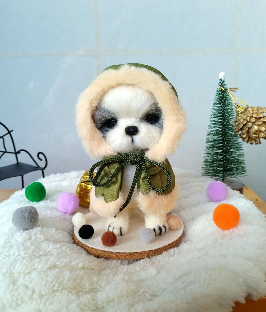 ♫モッズコートの冬シーズー 羊毛フェルト 台座付き プッチベア♫