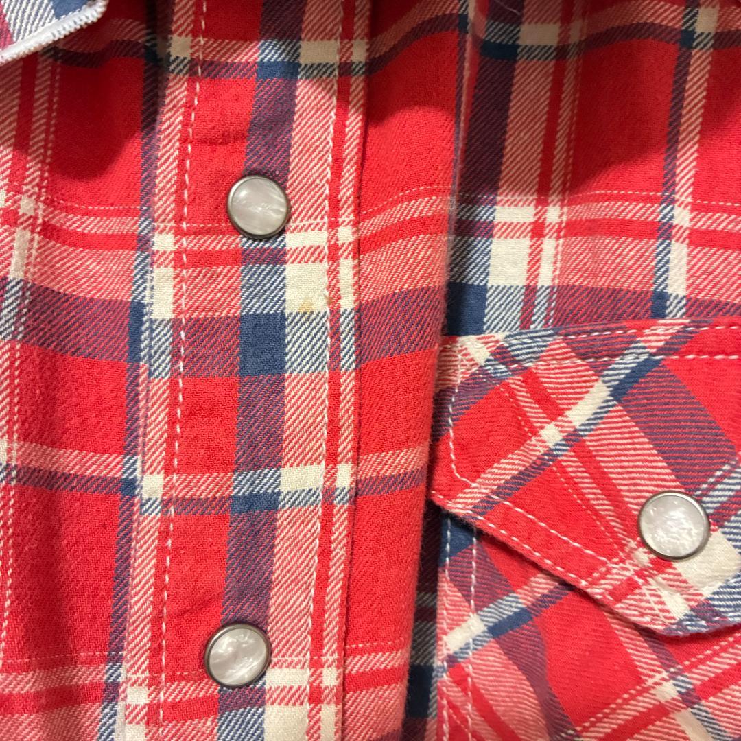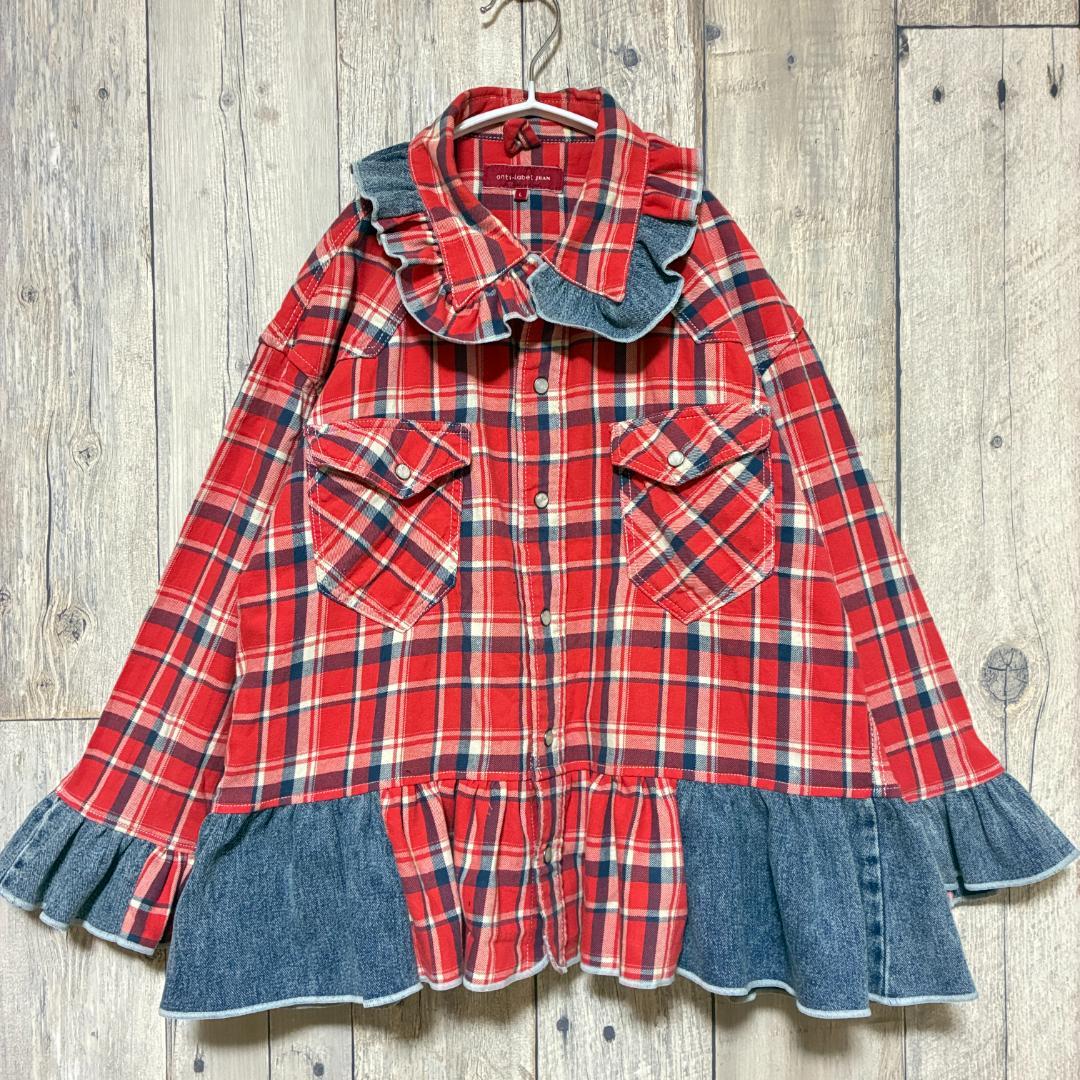 リメイク❣デニムフリル付きチェックシャツ9分袖 ピンク【古着】