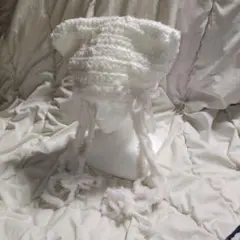 【No.008】 猫耳ニット帽 白基調 フリンジ付き