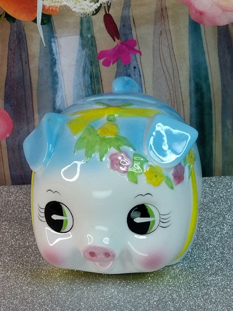 加藤工芸豚の貯金箱 陶器製ピギーバンク 水色は希少レトロ