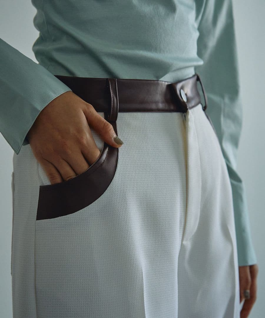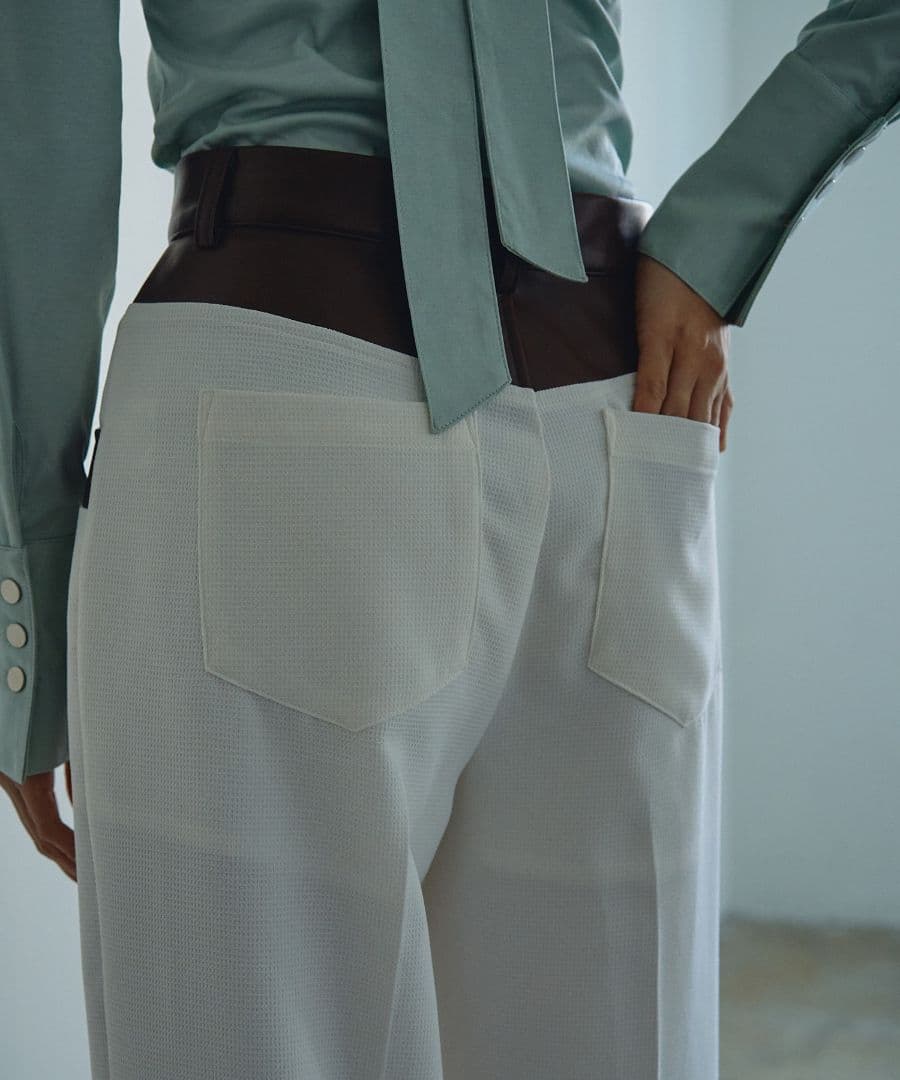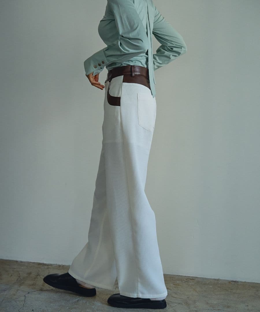 激安タグ付き【Aborアボア】ワッフル&フェイクレザートリムパンツ アイボリー白