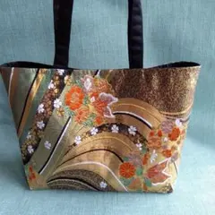 帯リメイク、花柄刺繍ゴールドトートバッグ