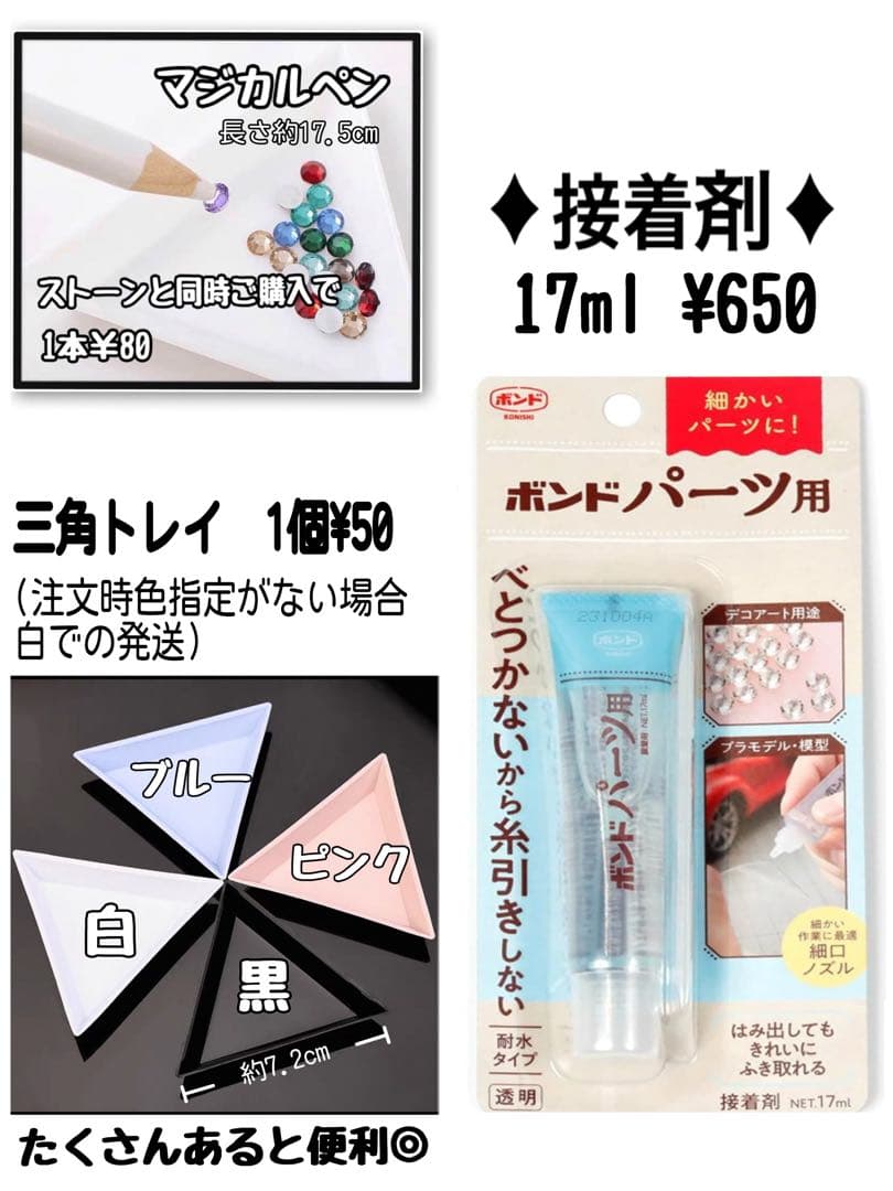 ご注文頂きありがとうございます 【もっと見る】をクリックして頂き、注文内容などご確認の上ご購入お願い致します ⚠️プロフにて記載している休業情報を必ずご確認頂いてからご購入お願い致します。コンビニ払いの場合、遅くても12/3の12時までにご入金お願い致します。12/3 12時以降のご入金は12/11の発送となります。 【特典】17.5cmマジカルペン1本➕MIXストーンプレゼント ブラック 半々×1、2mm×1 バイオレット 半々×1 ワイン 半々×1 クリームイエローAB 半々×1 パープルAB 半々×1 ※上記の内容でお間違いなければどうぞこのままご購入お願い致します。 300円 0セット 240円 6セット、ストーン合計6セット ペン¥ 接着剤¥ 三角トレイ¥ ★ 8セット未満のご注文→商品代+送料¥150 ★ 8セット以上のご注文→送料無料 ---ゆうパケットポストminiでの発送予定--- ⚠️1.5mmのブラックはバリや欠けているものが入っているため、気持ち程多めに入れております。ご了承頂いた上でご購入お願いいたします。 【⚠️注意⚠️注文のご案內】カラー名の一部 【AB】【透明AB】【マット】は省略しないようご注文お願いします‼️ 今一度画像よりご確認の上ご購入お願い致します。 ※生産時期/入荷時期が異なる場合は同じ製品・同じ色であってもサイズにより微妙に色が異なる場合がございます。 検索用 #高分子結晶ストーン #団扇 #アクセサリー  #ハンドメイド #クリスタル #ラインストーン #ミルキーストーン #スワロ代用 #レジン #デコパーツ#スマホデコ #高分子デコストーン #高分子ストーン #デコレーションパーツ #ストーン #デコ電  #ネイルパーツ #デコストーン #ネイルストーン #デコ団扇 #推し活 #ストーンデコ #団扇屋 #IQOSデコ #ライブ #SS3 #SS6#SS12 HONOストーン honoストーン