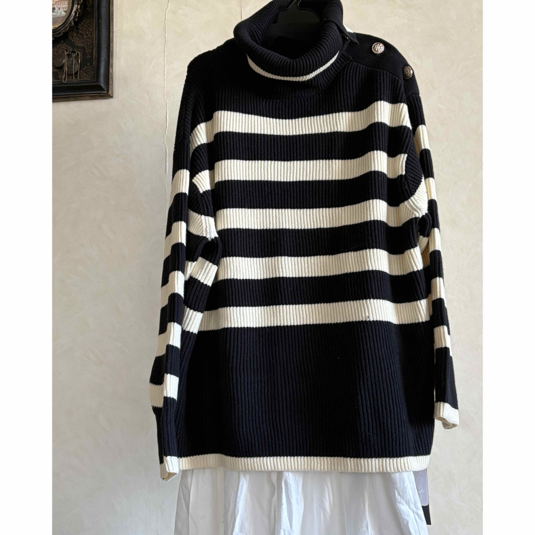ご覧頂きありがとうございます SCOTCLUBの商品の為最終お値下げになります🙇‍♀️ 評価に不安を感じます方のご購入申請はお受け致しません。過剰に敏感な方はショップにてご購入をお願い致します。 お取り置きはしておりません。即お支払い可能な方でお願い致します セール除外品ですが、お安くしています 単品でのお値下げは御免なさい🙇‍♀️ 新品タグ付き未使用 SCOTCLUBのゆったりボーダーニット ブラックです 首元から肩にかけてゴールドボタンがありますので、タートルの形を変える事が出来ます ザックリニットですので、パンツはもちろんですが、スカート合わせも素敵です ダウンベスト等と合わせるのがお勧めです 採寸 身幅約60cm 丈約63cm 素人採寸の為多少の誤差はお許しください 発送は小さく圧縮致します 宜しくお願い致します
