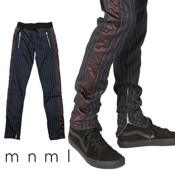 【70%OFF】 mnml ミニマル PINSTRIPE TRACK PANTS NAVY/BROWN ライン トラックパンツ トラック パンツ スキニー サイドライン ラインパンツ メンズ ジップ付 サイドジッパー サイド ジッパー 裾ジップ ZIP インポート ブランド ストリート ファッション