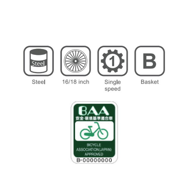 FrameSteelFrame size18” 215mmComponentSingle SpeedTire size18”×1.95 (E/V)Weight18” 13.2kgRider height18”105cm~Ground to saddle18” 505~610mmFull length18” 1250mmFull wigth18” 490mmBasketW270×D220×H190mm