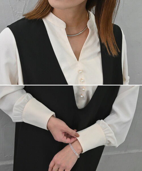 落ち感のあるとろみ素材や鎖骨が華奢見えするネックライン、胸元のパールボタンなど、着るだけで女性らしい華やかな印象に。
