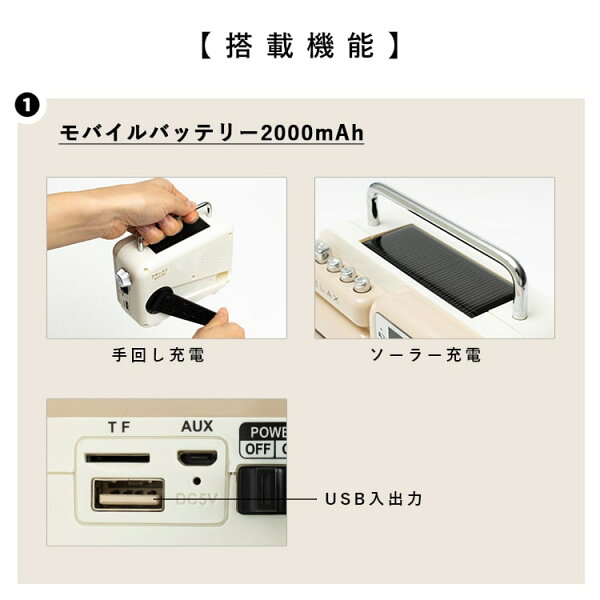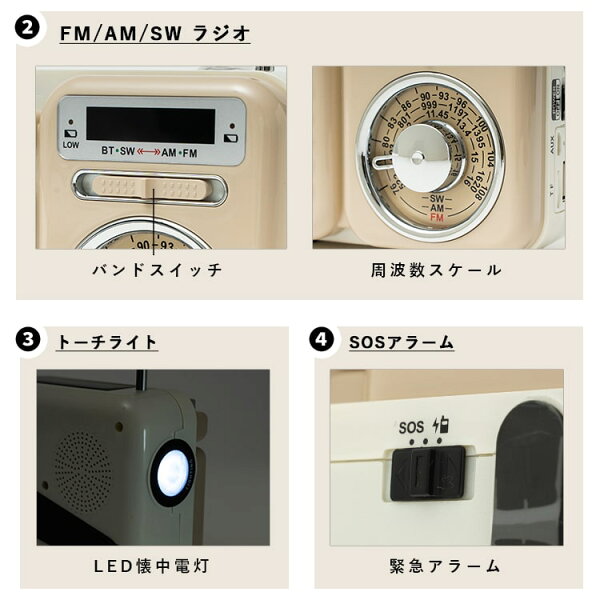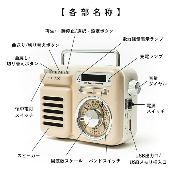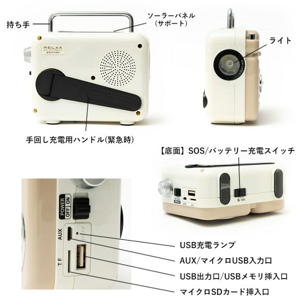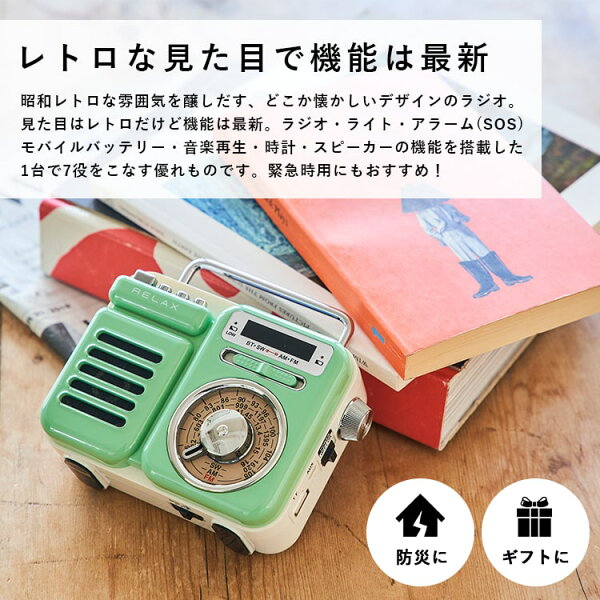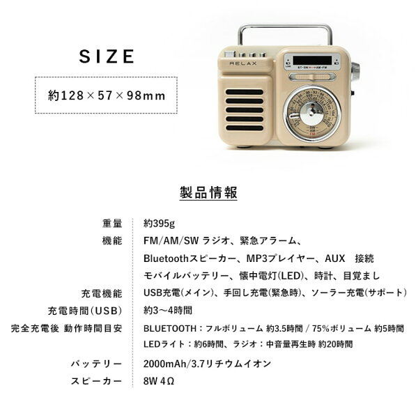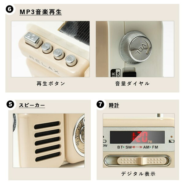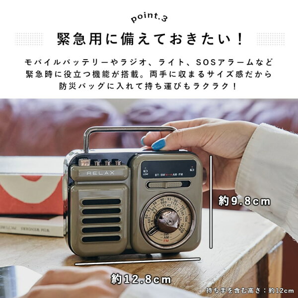 ラジオ レトロ 小型 多機能 防災 非常用 おしゃれ かわいい スピーカー モバイルバッテリー bluetooth アウトドア 懐中電灯 LEDライト ソーラー充電 RELAX プレゼント ギフト