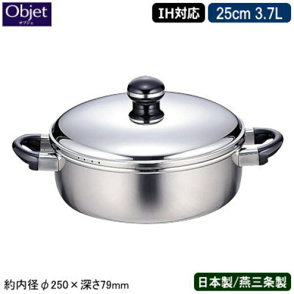 【両手鍋 日本製 燕三条 ステンレス IH対応】 Objet テーブルポット 25cm 3.7L 【業務用/家庭用/IH 対応/IH電磁調理器 対応/オール熱源対応/浅型両手鍋/下ごしらえに/プロ仕様/5年間保証/保温性/煮物/煮込み料理/魚/煮付け/おでん/すき焼き】 即発対応 qe