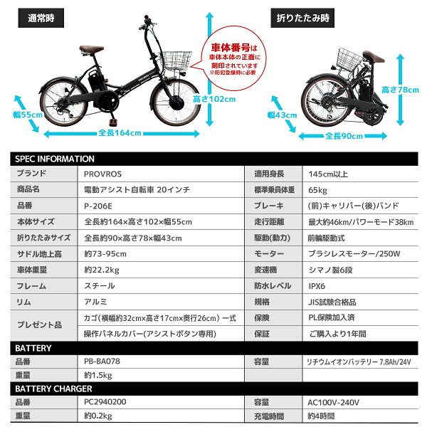 高評価★4.3【週間ランキング1位連続受賞】PROVROS 電動自転車 折りたたみ 電動アシスト自転車 20インチ シマノ6段変速 リチウムイオンバッテリー 前輪駆動 最大46km走行 型式認定 公道可能 プロブロス P-206E