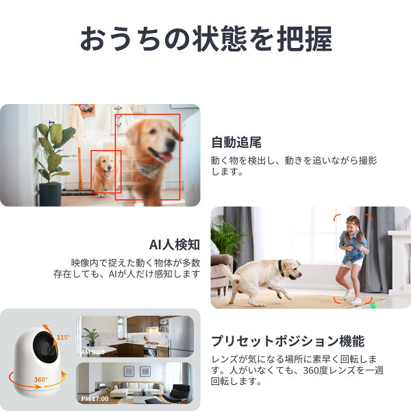 【AI動体検出&自動追尾撮影】動く人や物体を検知し、自動で追尾して追跡録画を開始。おうちの日常状態も、ペットや我が子の可愛い姿もバッチリ捉えます。