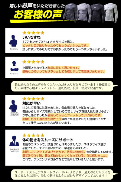様々な スポーツ にてお使い頂いています。また、 作業用インナー として、 作業服 作業着 としても好評です。 ランニング ストレッチ アウトドア ゴルフ 筋肉トレーニング 筋力トレーニング サッカー フットサル 運動 ジョギング スポーツ ダイエット テニス トライアスロン トレーニング バスケットボール バスケ フィットネス マラソン 加圧トレーニング 格闘技 筋トレ 自転車競技 登山 野球 陸上
