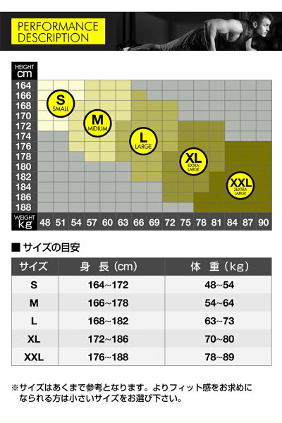■サイズ: S M L XL XXL ( 2XL ) 5サイズ ( Sサイズ Mサイズ Lサイズ XLサイズ XXLサイズ ) 展開 サイズの目安 S 身長:164~172cm 体重:48~54kg M 身長:166~178cm 体重:54~64kg L 身長:168~182cm 体重:63~73kg XL 身長:172~186cm 体重:70~80kg XXL 身長:176~188cm 体重:78~89kg ※サイズはあくまで参考となります。より強いフィット感を求める方は小さめのサイズをお選び下さい。 小さいサイズ から 大きいさず まで幅広い体型の方にフィットできる幅広いラインナップ