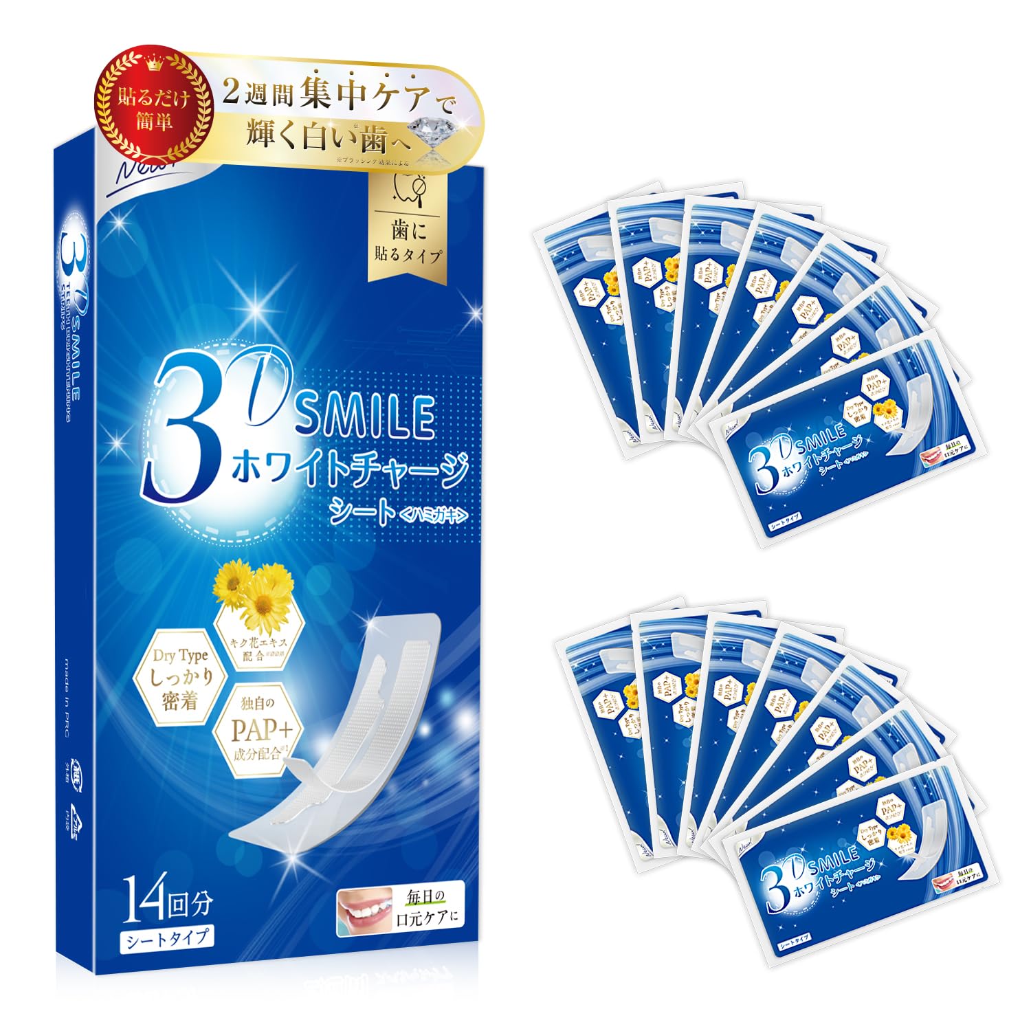 【使い方簡単】 ①フィルムからパックシートを剥がします、乾いた清潔な手で剥がしてください。 ②鏡を見ながら上下の歯にパックを貼りつけます。余った部分は折り返して、歯の裏側に貼り付けてください。長方形のシートが上の歯用、扇形が下の歯用です。 ③パックを貼った状態で20~30分待ってください。その際、口を閉じていてもかまいません。 ④時間が経過したら、テープを剥がし、歯ブラシでブラッシングしてください。 【使用上の注意】 ◇本来の用途以外には使用しないでください。 ◇口の中の粘膜が弱い方は、刺激等の症状が出る場合があります。 ◇口内炎·傷口·湿疹等、 粘膜に異常がある部分には直接つけないでください。 ◇乳幼児の手の届かないところに保管してください。