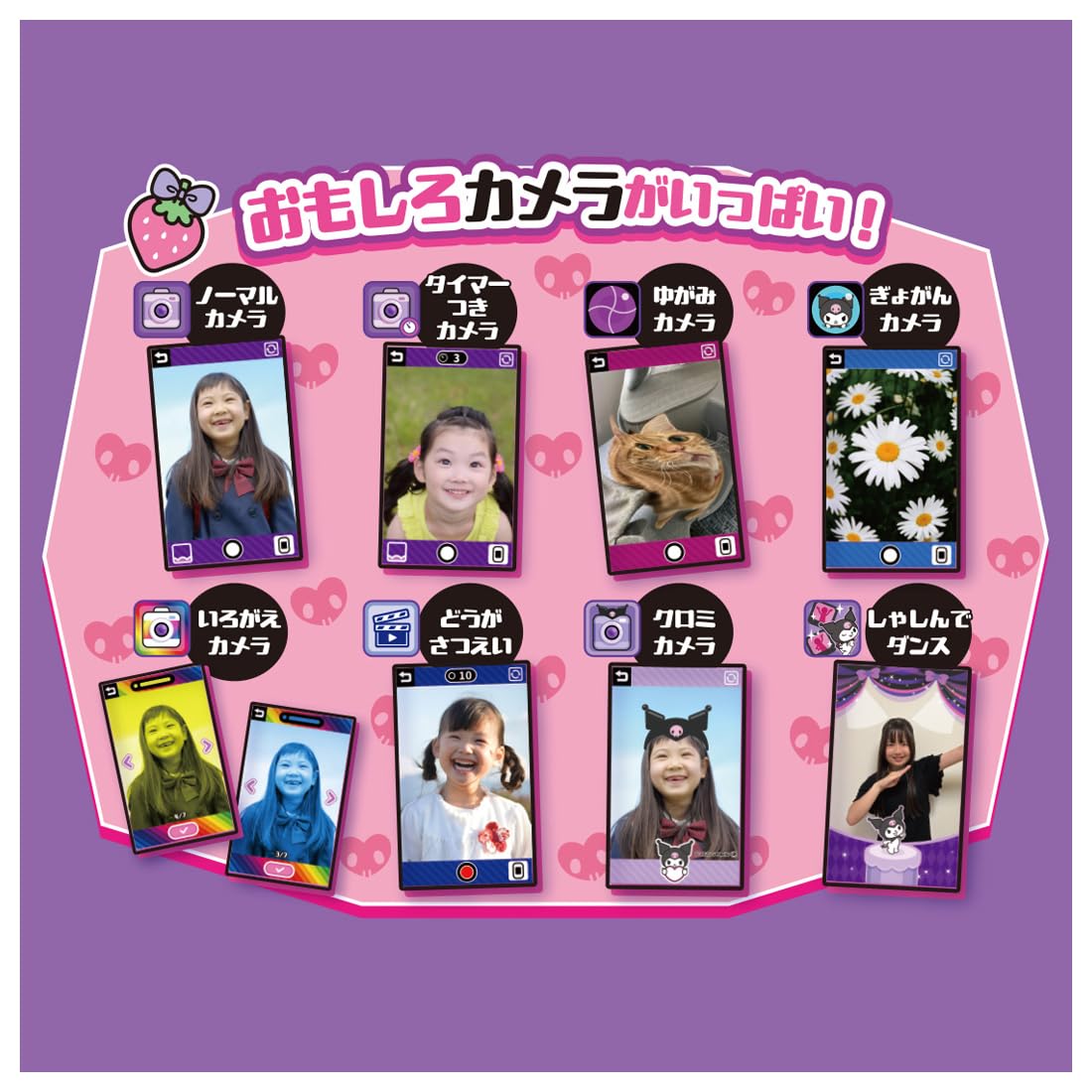 ・ゆがみカメラ、いろがえカメラ、かぶりものカメラなど、エフェクトつきのカメラがいっぱい!