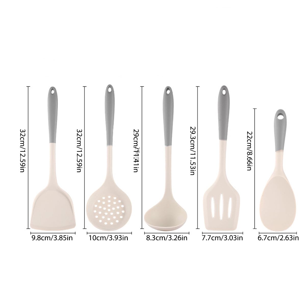 これらの調理器具セットは、オフホワイトのシリコンヘッドとグレーのハンドルが特徴です。食品グレードのシリコン製で耐熱性があり、ノンスティックフライパンにも安心してお使いいただけます。各ハンドルには吊り下げ用の小さな穴が付いています。 仕様: 素材:シリコン サイズ: 32 x 9.8 cm 色:クリーミーグレー パッケージ内容: 調理器具 5点セット