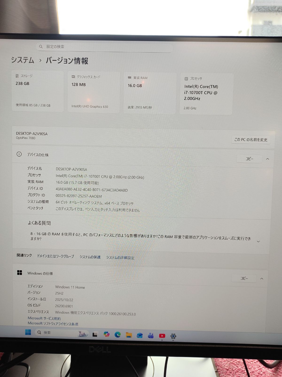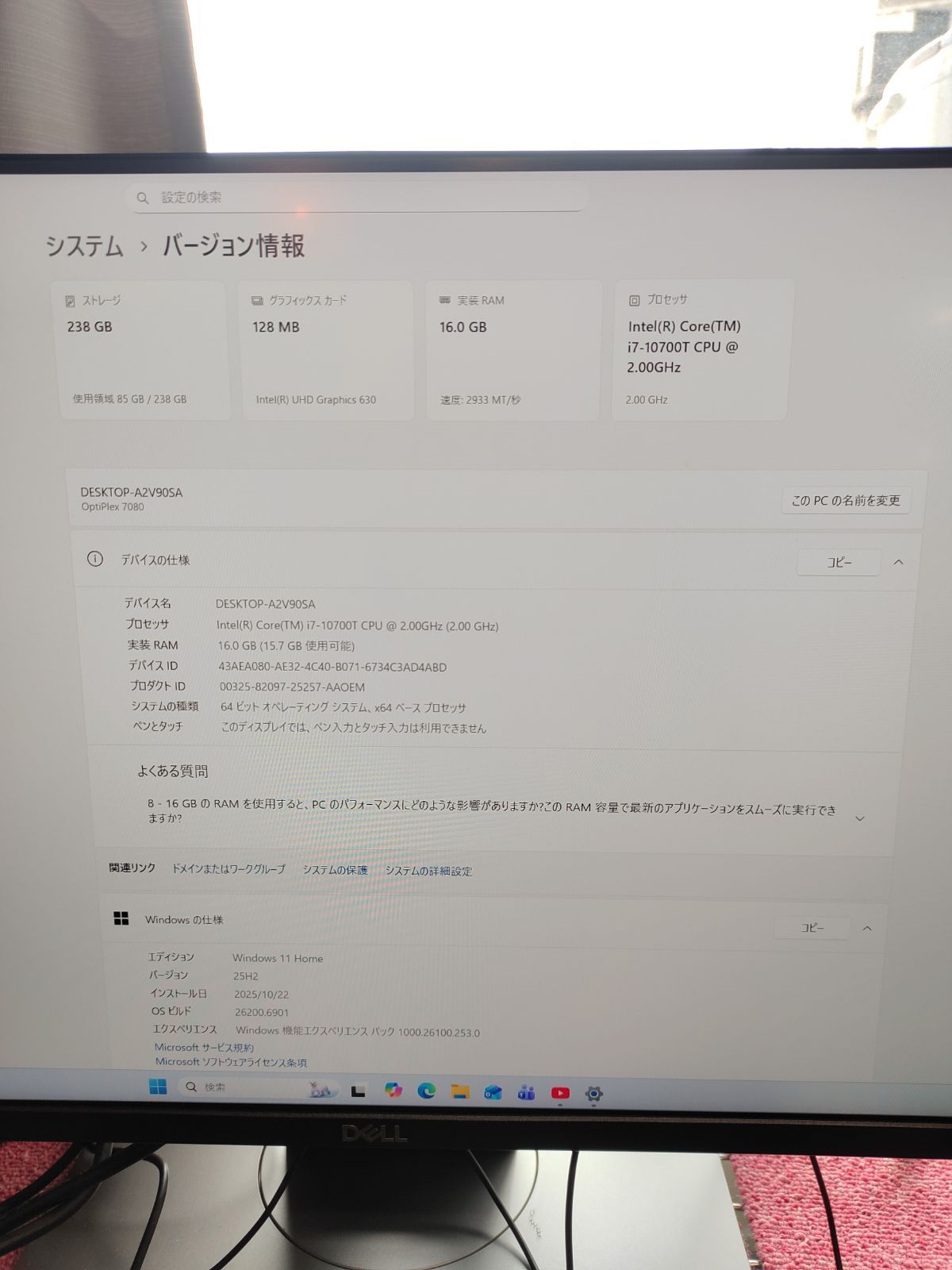 ◎小型PC モニター 直付け専用スタンド セット販売 DELL OptiPlex 7080 core i7 10700T Windows11 SSD 256GB RAM 16GB モニター DELL P2421DC 2560×1440 2K WQHD