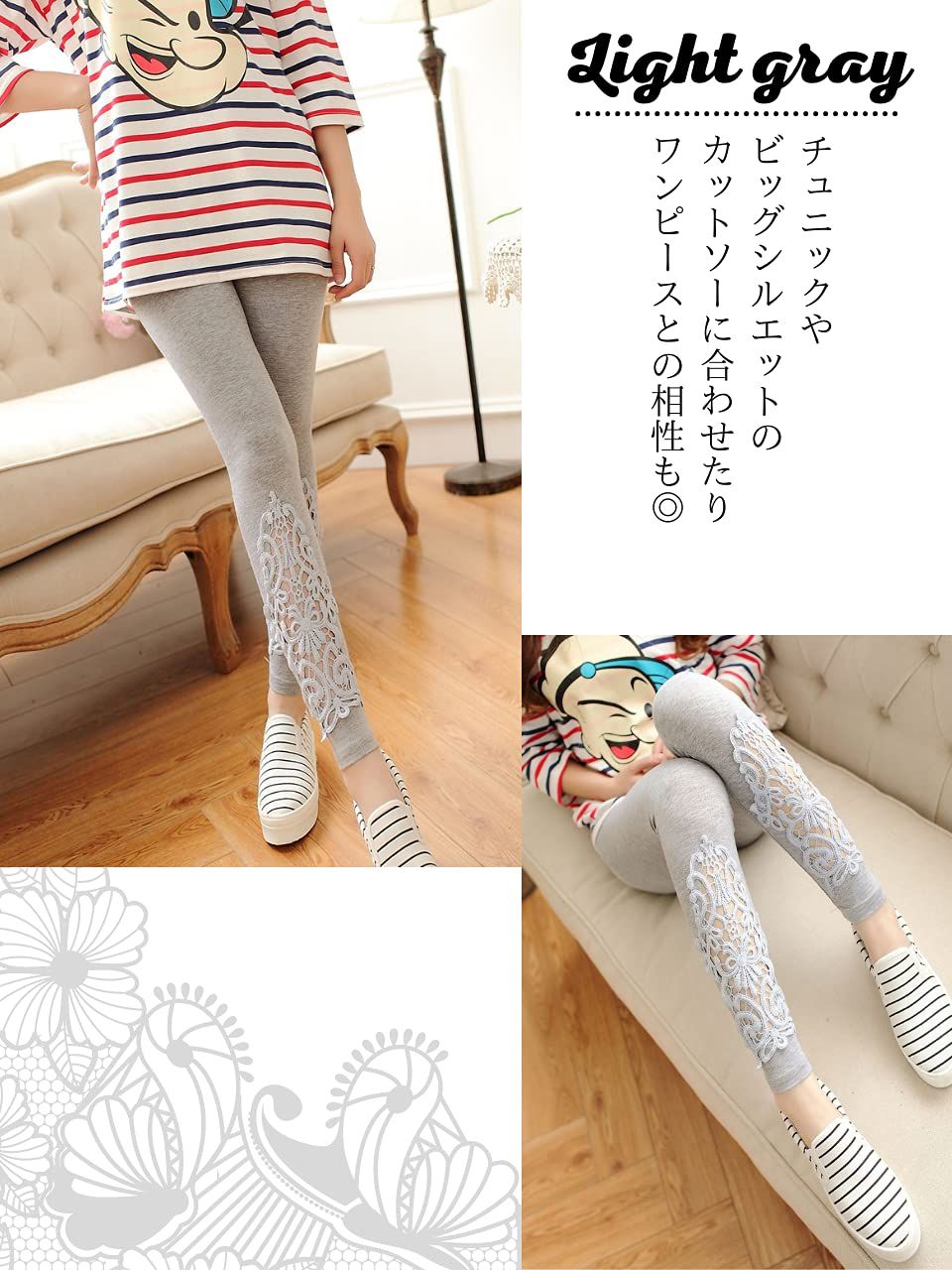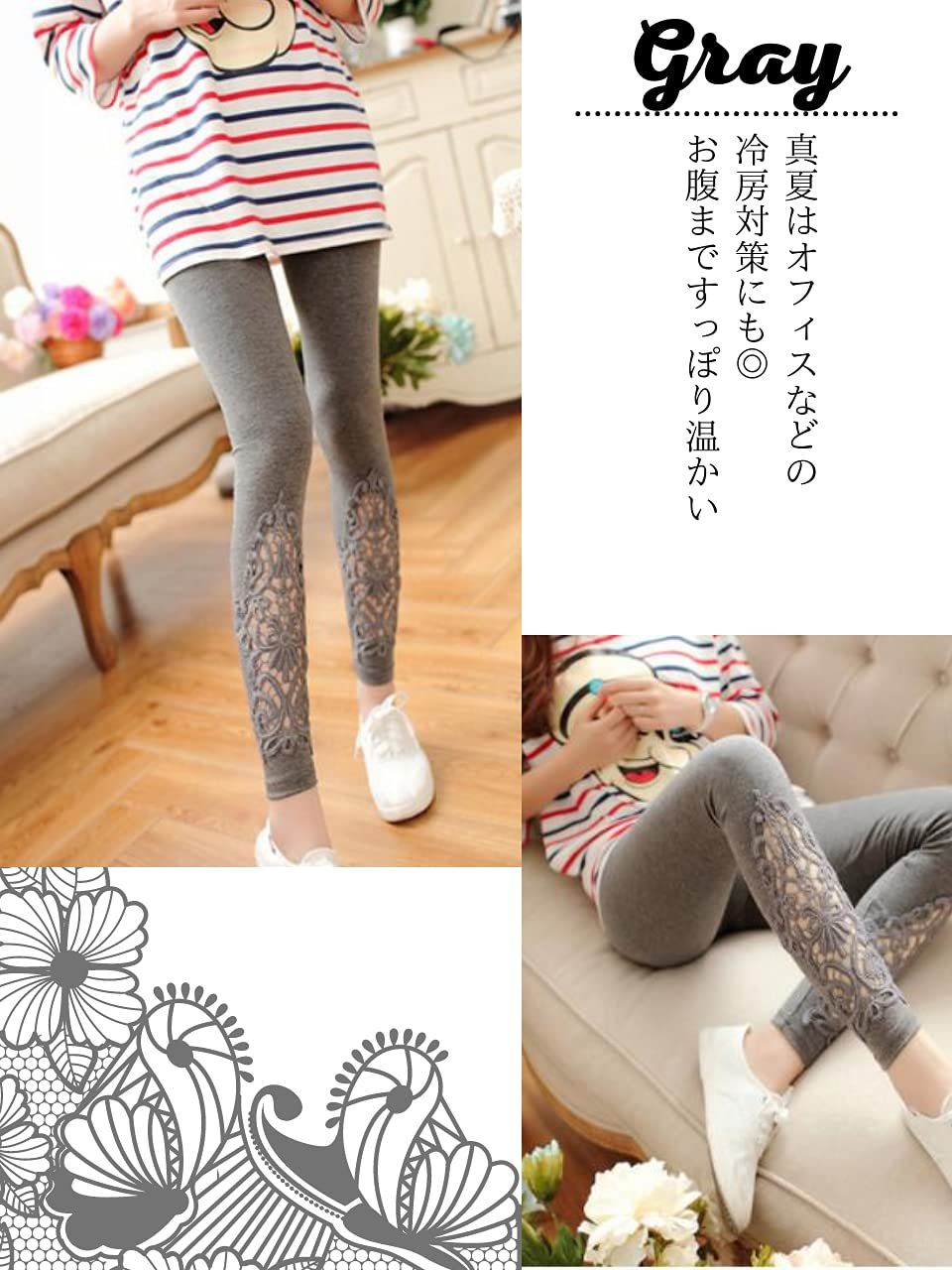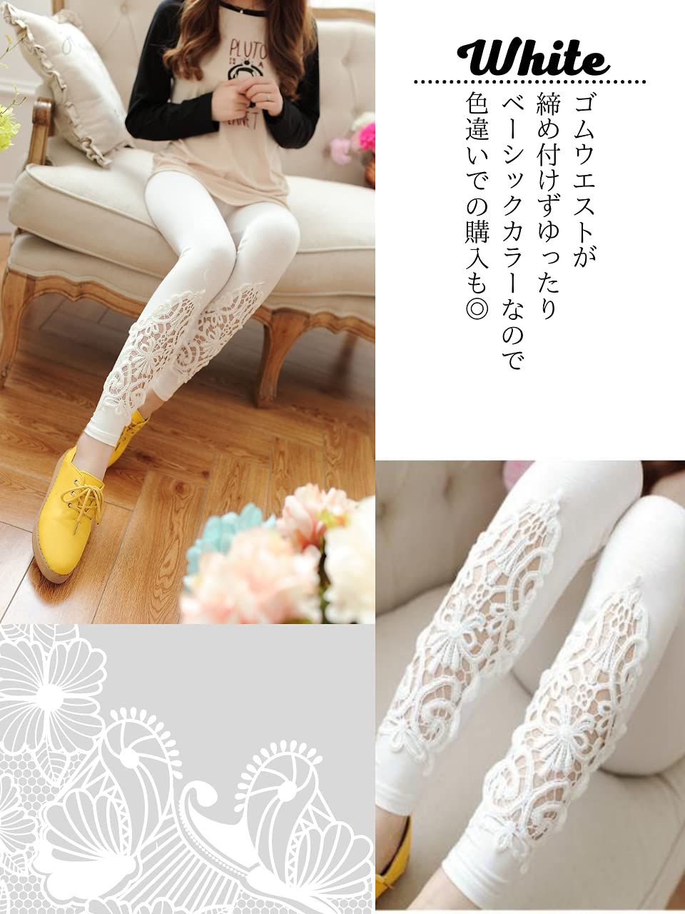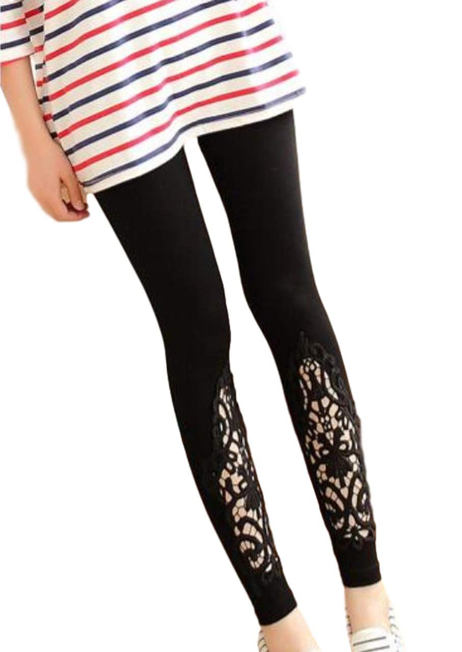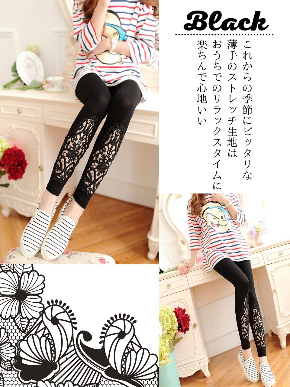 [ソユル]レース 花柄 9分丈 レギンス スパッツ レギパン フリーサイズ ストレッチ レディース ブラック 黒 くろ クロ おしゃれ 人気 かわいい パギンス トレンカ スキニー タイツ ウエスト ゴム ボトムインナー [ブラック] [Free Size]