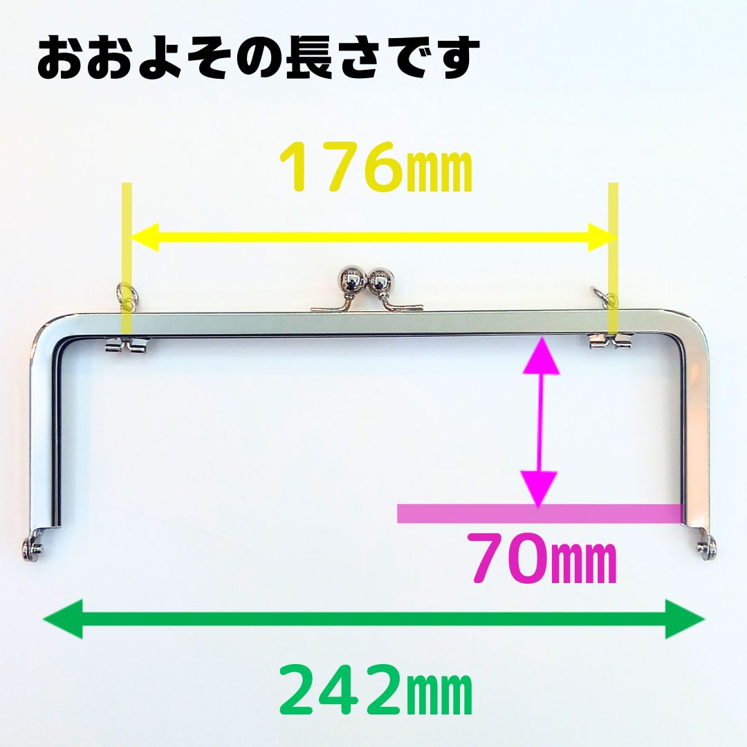 -=-=-=-=-=-=-=-=-=-=-=-=-=-=-=-=-=-=-=-=-=-=-=-=-= この度はご覧いただきましてありがとうございます♪ 送料無料、即購入可能です! 【商品詳細】 商品名:がまぐち口金 全長242mm 高さ70mm 幅5mm×2(リング付) 1個 サイズ:写真をご確認ください 色:ニッケル  重量:約96.2g 入数:1個 バッグ作りなどに使用されるリング付きのがま口金具です。サイズや形状などよくご確認ください。 【注意】 ○素人検品ですので、細かい傷や多少の点サビ、塗装ムラ、メッキの粗、寸法の誤差、その他個体差などがある場合がございます。また、簡易包装での発送になります。 ○方眼マットの写真は自然光のもとで撮影しています。色合いの参考にしてください。 ○万が一届いた商品に不具合等がございましたら、お手数ですが評価前にご連絡をお願い致します。 【発送について】 ○通常、2営業日以内に発送いたします。ただし、土日祝・年末年始・お盆休み等の兼ね合いにより連絡や発送が遅れることがございますことをご了承ください。 ○通常の送料は出品者負担です。500円以上の商品は「らくらくメルカリ便」を想定しています。500円未満の商品は「普通郵便」を想定しており、追跡等は対応でき兼ねます。 【値下げについて】 ○値下げ交渉には対応できかねますが、まとめ買いしていただく際には、わずかですがサービスさせていただきます。2点以上購入いただく際には、購入前にコメントでご相談ください。 ハンドメイド クラフト 金具 手芸 DIY パーツ レザークラフト 革細工 革製品 -=-=-=-=-=-=-=-=-=-=-=-=-=-=-=-=-=-=-=-=-=-=-=-=-= 出品者用メモ hk_25_0208_03 12g+96.2g 1000g以内:ok A4*3cm以内:ok R2:hk_25_0510_03 R4:r4_25_1121_01
