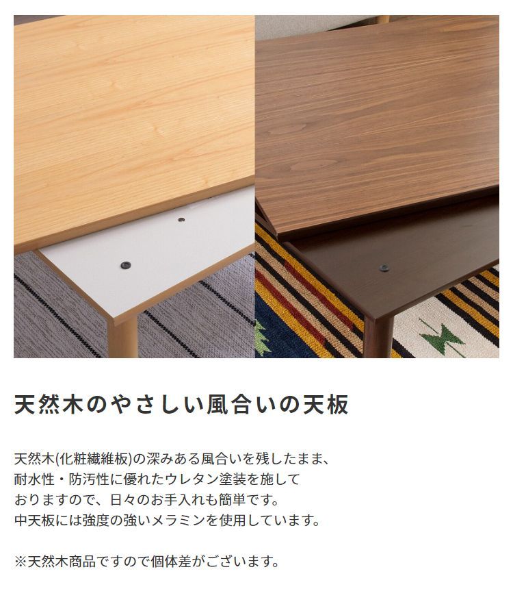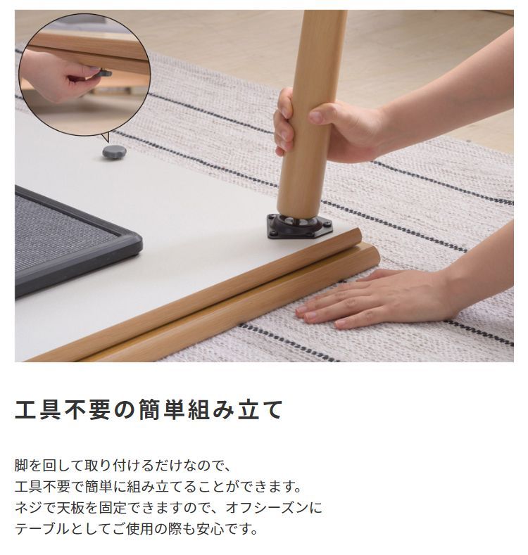 薄型フラットヒーターのこたつテーブル 木のぬくもりを感じるシンプルモダンなデザインの こたつテーブルです。 薄型フラットヒーターなので内部を広々使え、オフシーズンは 布団を外してそのままテーブルとして使用できます。 幅広のカーボンヒーターで温度のムラがなく、 こたつ全体を均一に温めることができます。 【本体サイズ(cm)】(約)幅105×奥75×高さ38cm 【梱包サイズ(cm)】(約)幅116×奥行88×高さ13cm 素材 【ウォールナット】 天然木化粧繊維板(ウォールナット) 【ナチュラル】 天然木化粧繊維板(アッシュ) 【共通】 天然木(ラバーウッド) ウレタン塗装 カーボンフラットヒーター300W(MCR-301E) 手元コントローラー 重量 【本体重量】(約)18.5kg 機能 ●組立品 ●工具不要 ●脚ねじ込み式 ●薄型カーボンフラットヒーター ●静止耐荷重:20㎏ ※北海道、沖縄、離島は別途追加送料が発生致します。 【ご購入時の注意事項】 ■ 在庫について ■ ・当店では在庫をシステム管理しておりますが、更新のタイミングによっては在庫切れとなる場合がございます。 → その際は「代替商品のご提案」または「キャンセル対応」となる場合がございます。 ■ 送料について ■ ・北海道・沖縄・離島へのお届けには、別途送料が発生する場合がございます。 → ご注文前に必ず商品ページや配送条件をご確認ください。 ■ キャンセルについて ■ ・ご注文後はすぐに出荷準備へ入るため、お客様都合でのキャンセルは基本的に承っておりません。 → 詳細は「役務又は商品の引き渡し時期」に記載しておりますのでご確認ください。 ■ 返品について ■ ・商品に不備があった場合は交換を承ります。 ・商品到着後7日以内(評価完了前)にご連絡をお願いいたします。 → 詳細は「ショップ内 返品についての特約」をご確認ください。