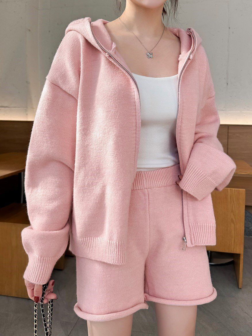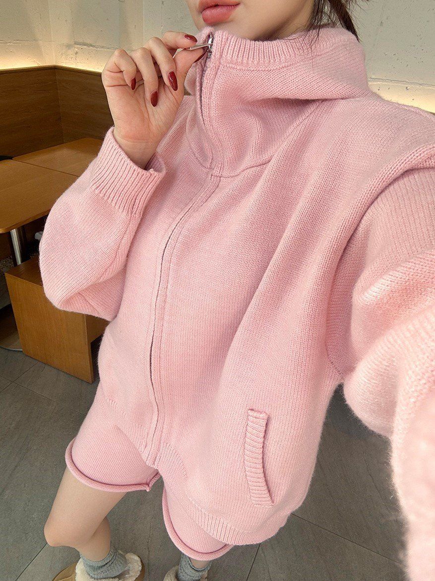 (カオ フード セット)ニット フード ジップアップ カーディガン ハーフパンツ ハイネック ルーズ ベーシック 冬