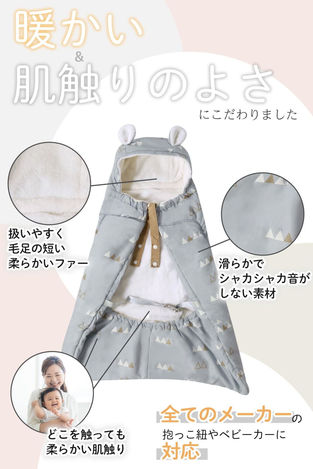 [あったかくて優しい素材の3WAYベビーマルチブランケット]抱っこ紐ケープ、ベビーカーブランケット、おんぶケープの3WAY仕様。用途に合わせた使い方で、寒い日も暖かく快適にお出かけできるベビーマルチブランケットです。頭から足元まで赤ちゃんをスッポリ覆えて暖かい!柔らかく乾燥しにくいファー素材を厳選し、外側生地も滑らかで手触りのいい生地を採用しました。どこを触っても柔らかく優しく抱っこ紐ケープです。内側には扱いやすい毛足の短めのファーを絡まりにくく毛玉のできにくい生地を採用しました。外側は滑らかでシャカシャカ音がしない素材なので赤ちゃんが寝てしまっても静かにおやすみできる抱っこ紐ケープが出来上がりました。軽量なので着けていてもノンストレス&使わない時の持ち運びも楽々できます。抱っこ紐ケープとして使用する時に、ご使用する方の手元も温めるポケット付きです。 赤ちゃんに触れる手も暖かく、スマホやカイロを入れることもできます。寒い日のお出かけも楽しく快適にお過ごしいただけるようなベビーブランケットをぜひお試しください。