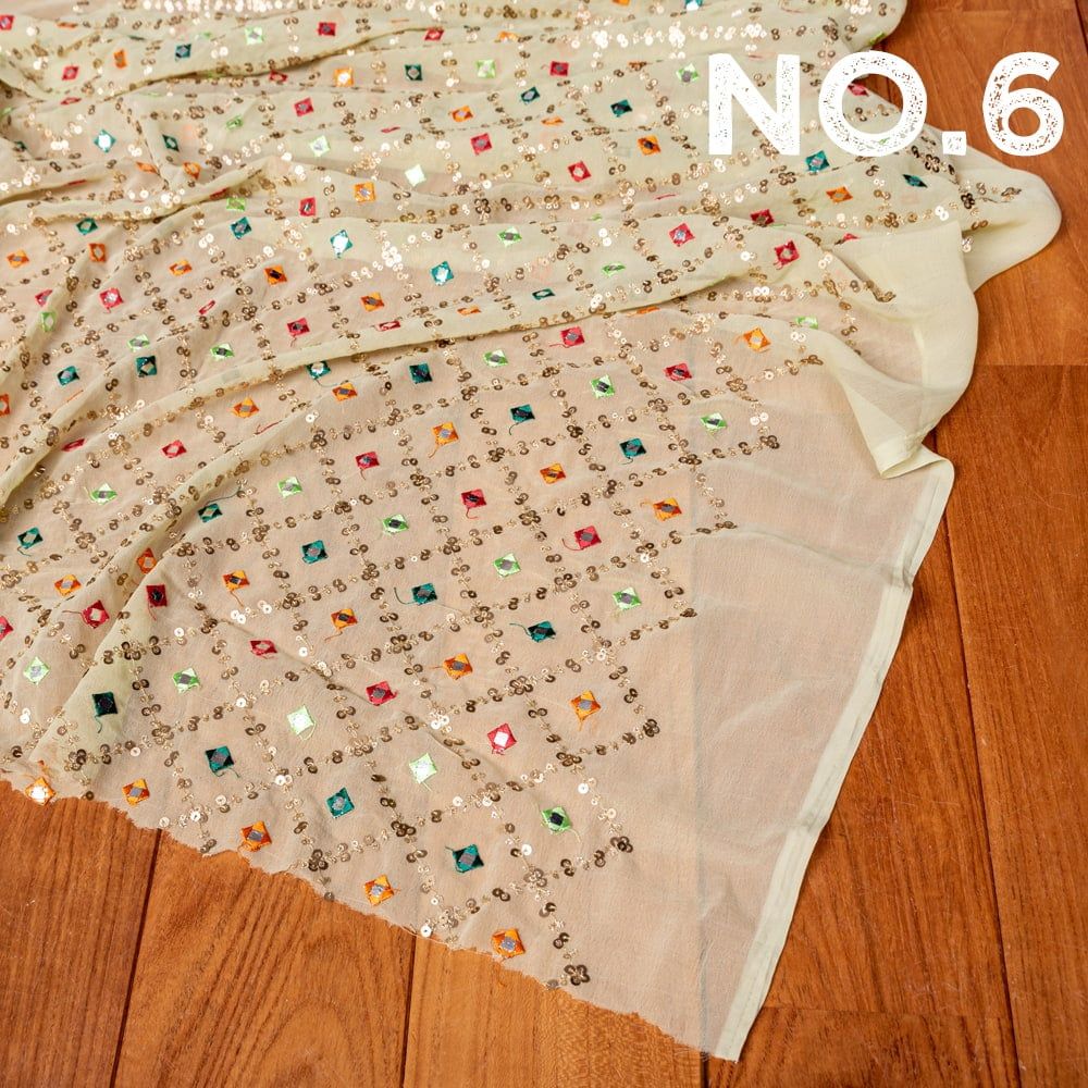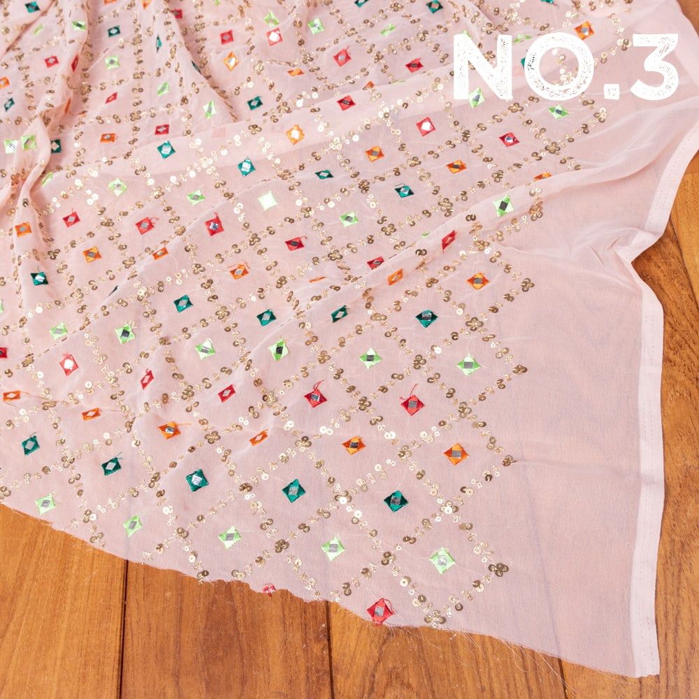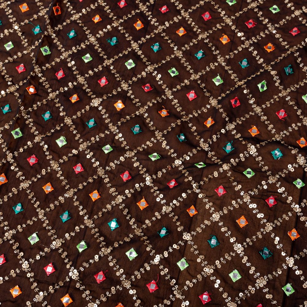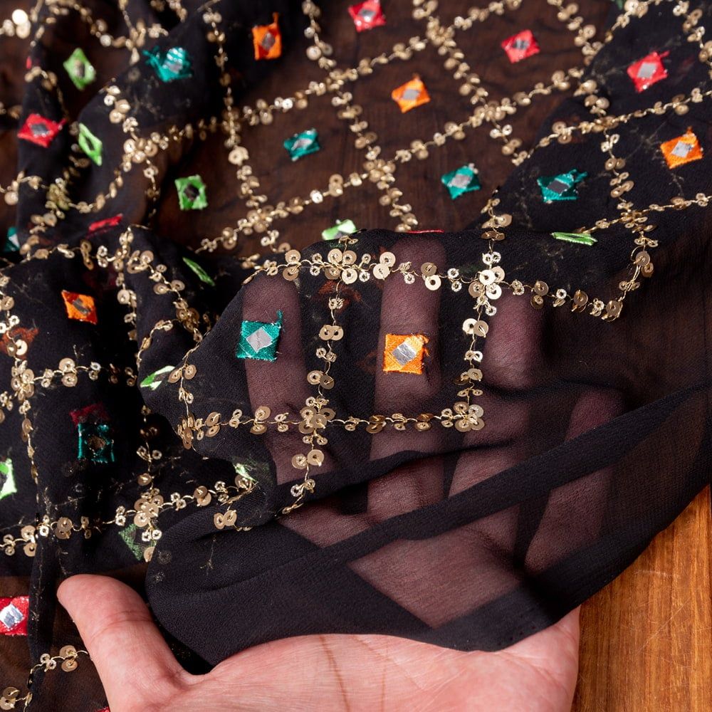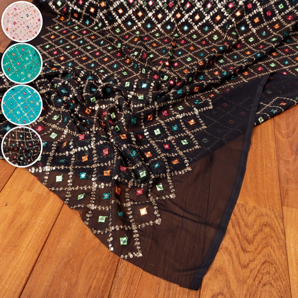 インドからやってきたシンプルだけどありそうでない、メッシュ生地の布です。スパンコールや刺繍など、インドらしい輝く装飾が施されていて、光を受けると華やかな雰囲気に。