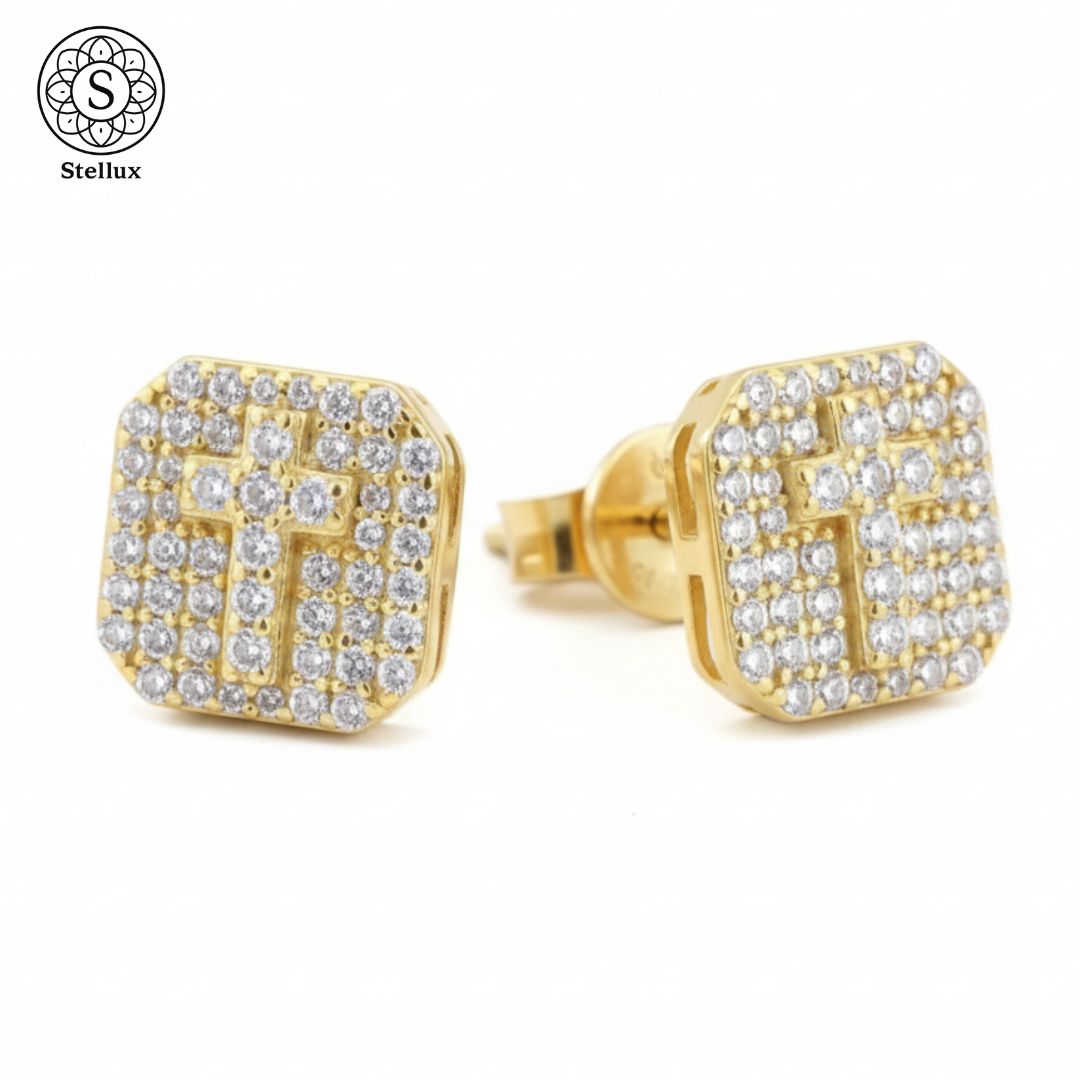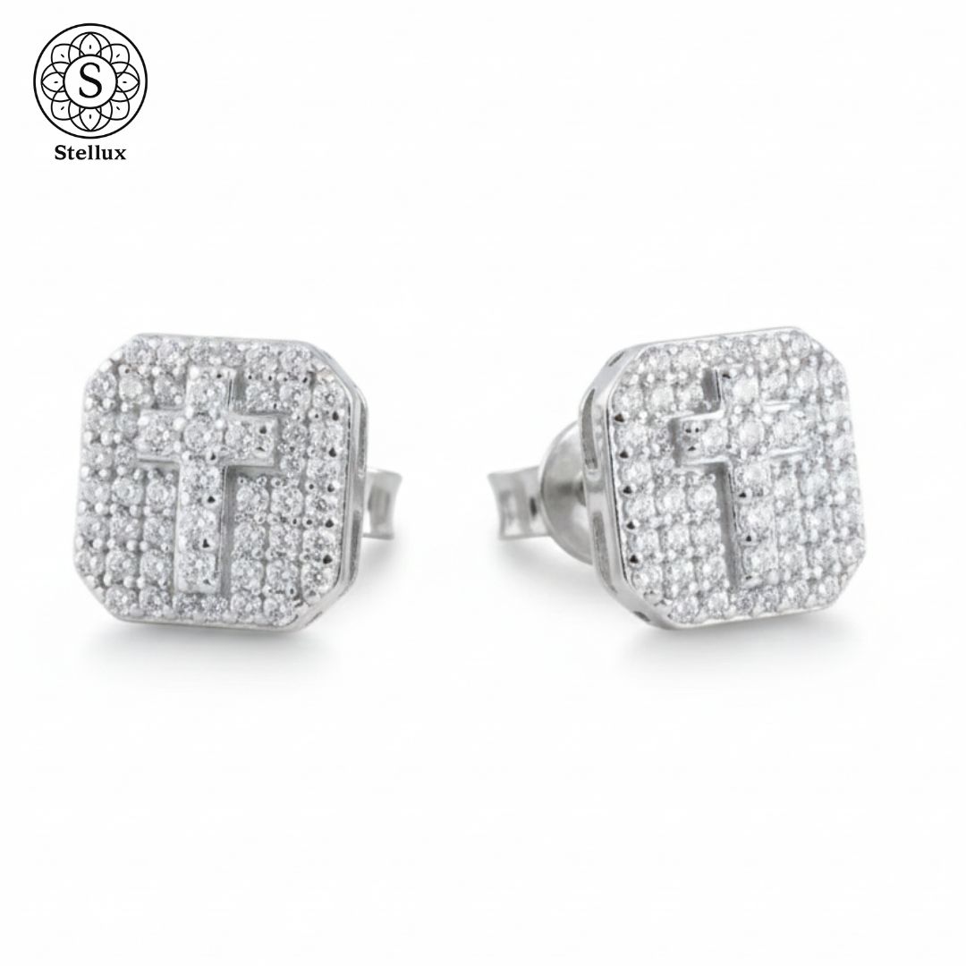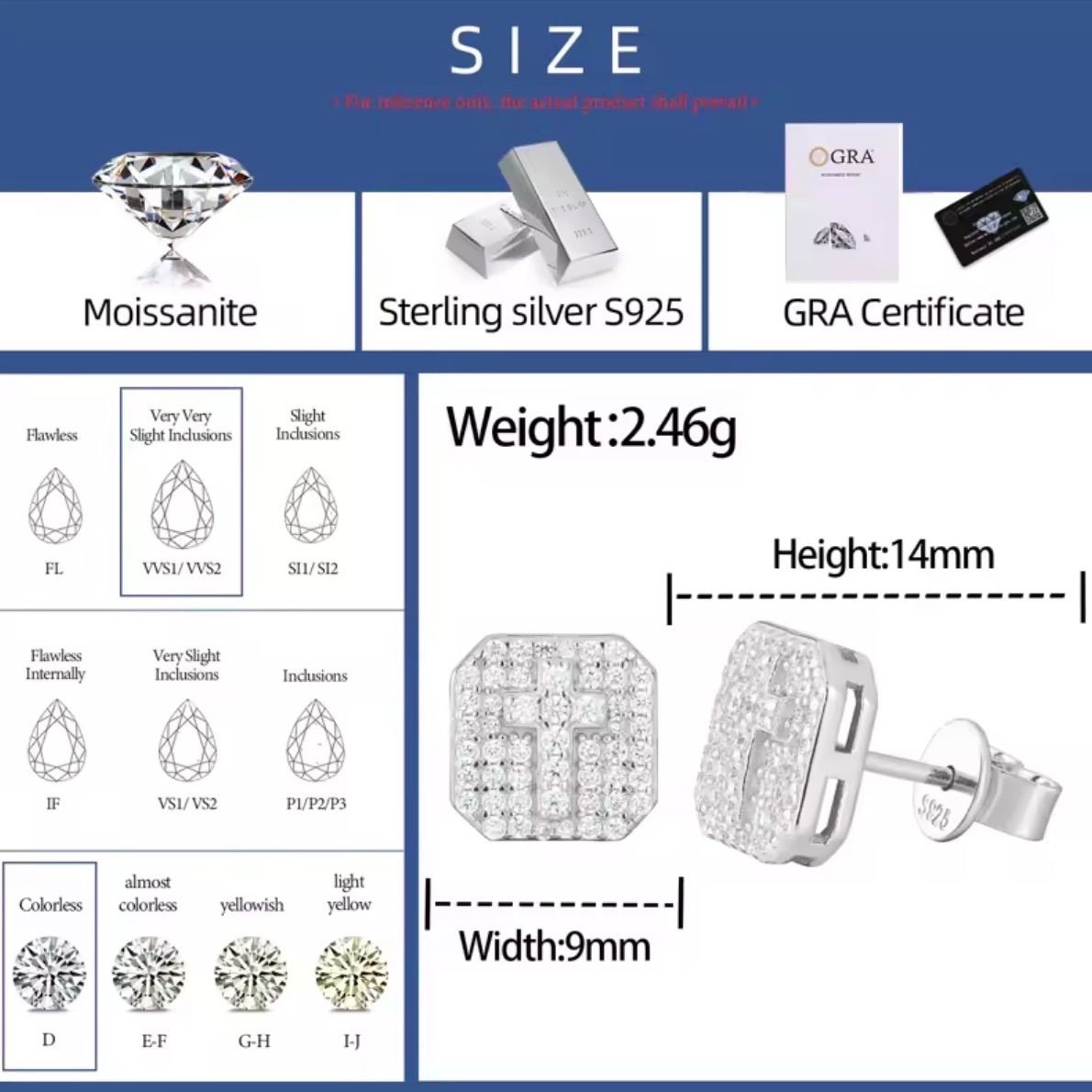 ・モアサナイトを敷き詰めたフレームが、センターのクロスを額縁のように引き立て、耳元に“ジュエリーの塊”のような迫力をつくります。