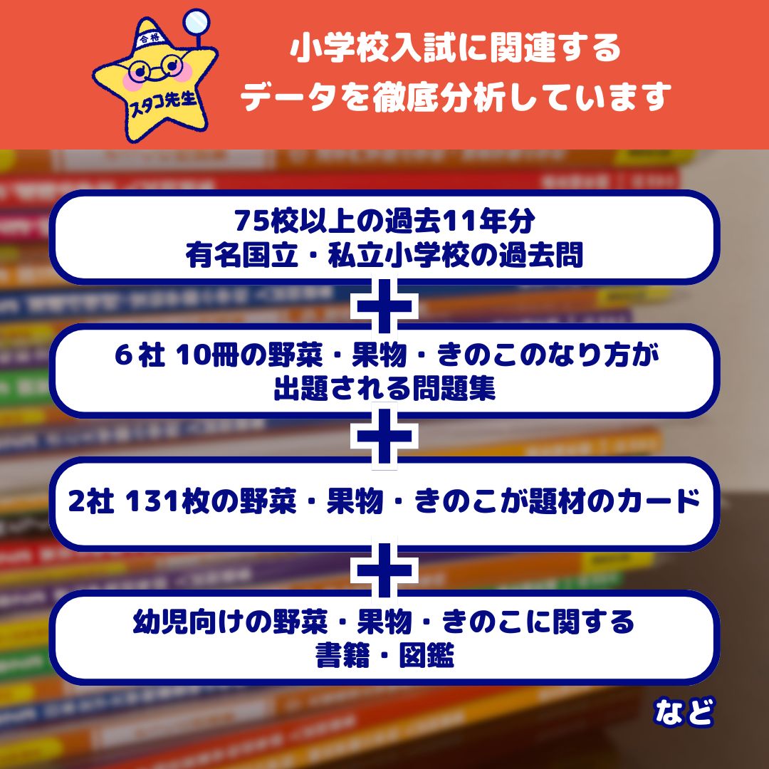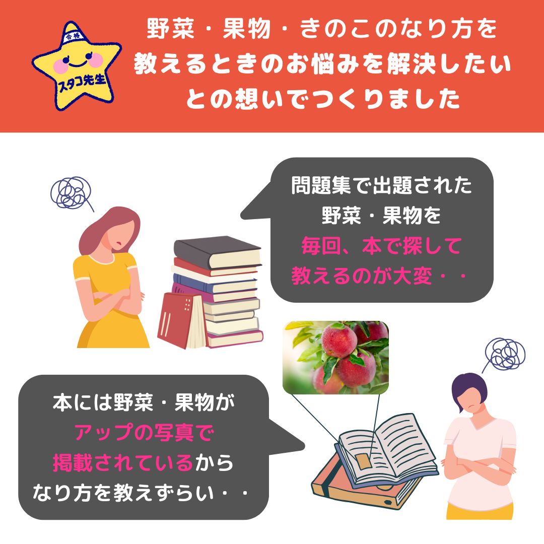 問題集で出題された野菜や果物を本で探すのが大変…本に掲載されている写真がアップのため野菜や果物のなり方が説明しずらい…そんなお悩みを解決したいとの想いでつくりました。